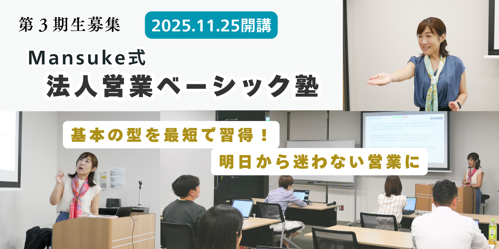 Mansuke株式会社(東京都港区、代表取締役 植野由芙子)は、「Mansuke式 法人営業ベーシック塾(第3期生)」の募集を開始しました。