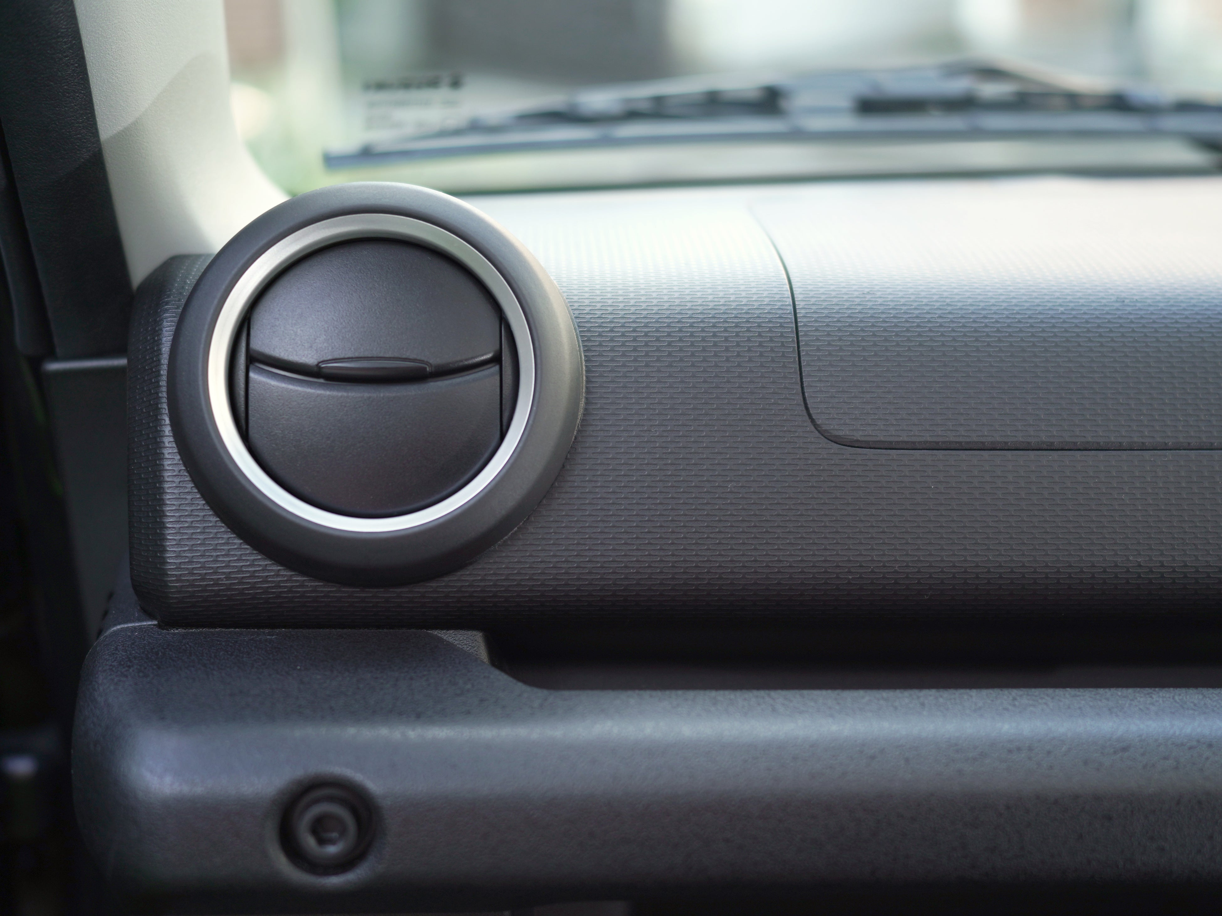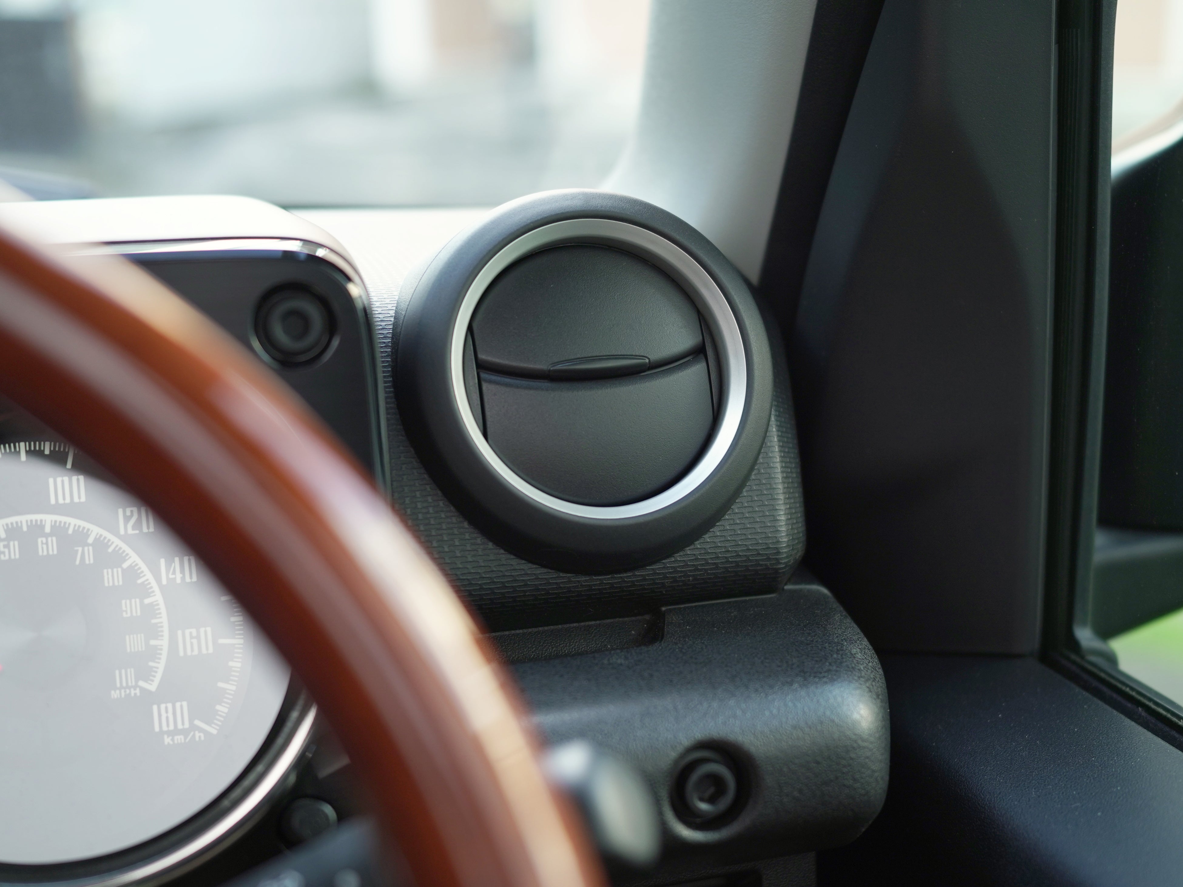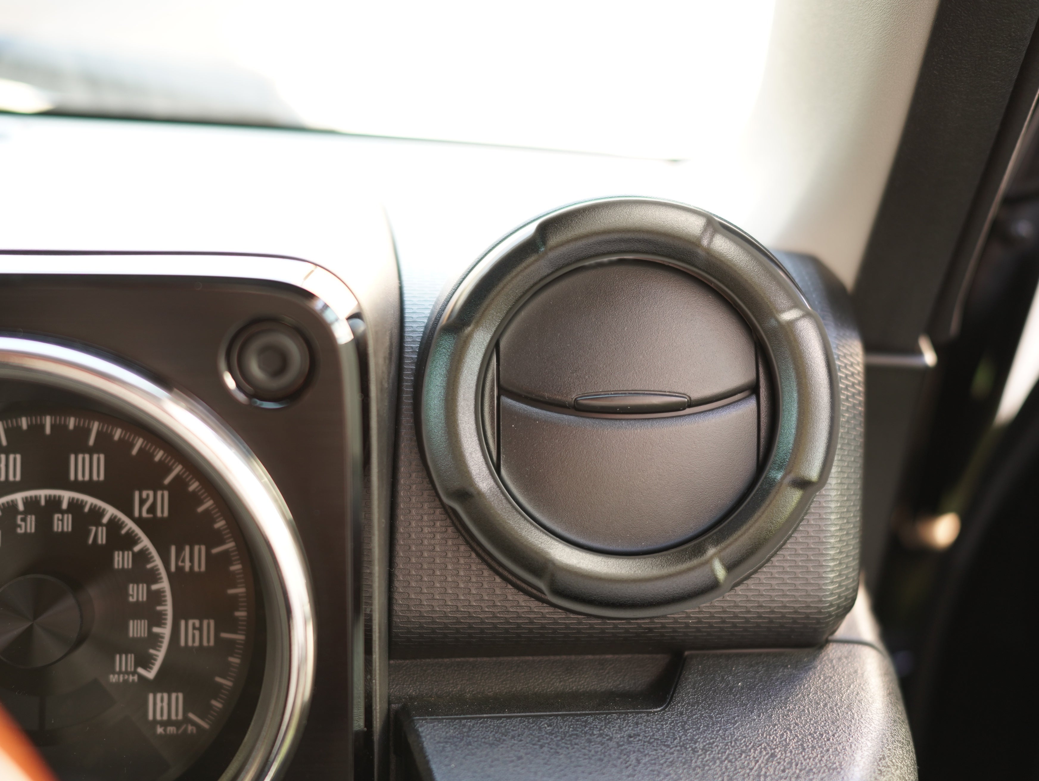 「エアコンルーバーリングキット」は、スズキ・ジムニーシリーズ専用の左右のエアコン送風口のリング状装飾部品「エアコンサイドルーバーリング」を交換するパーツで、純正インパネ中央部のエアコン操作3連ダイヤルと統一感を持たせたシンプルなデザインが特徴です。当社独自の「引き算のデザイン」で、インパネ全体をすっきりとクラシカルにまとめることができます。
