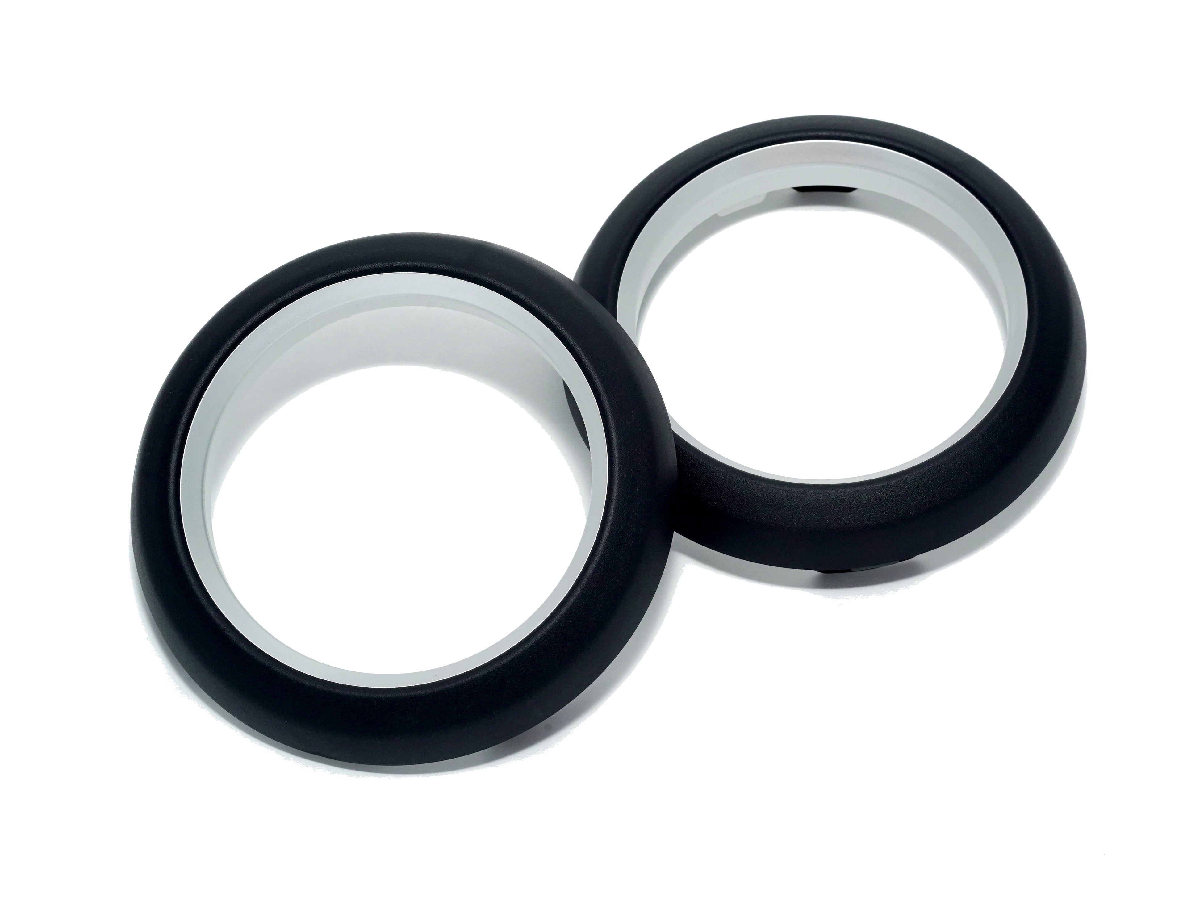 装着は、純正のエアコンサイドルーバーリングと交換するだけなので、DIYでも可能です。このキットは、外側と内側のリングの二つの部品で構成されており、外側は純正インパネと同等のポリプロピレン樹脂として表面を梨地処理し、内側は塗装に適したABS樹脂を採用しました。内側はシルバー塗装としていますが、自分で好きな色に塗装して楽しむことも可能です。上記の「1DIN オーディオパネルキット」と組み合わせれば、スマートなインパネが完成します。