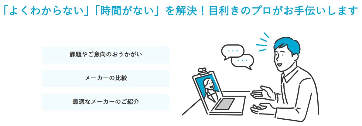 メーカーに問合せするには時期が早い。そもそもの前提知識をつけたい。誰に相談すればいいかわからない。といったお悩みに対し、最短1時間後からすぐにZoom面談が可能な手軽に相談できるサービスとなっております。