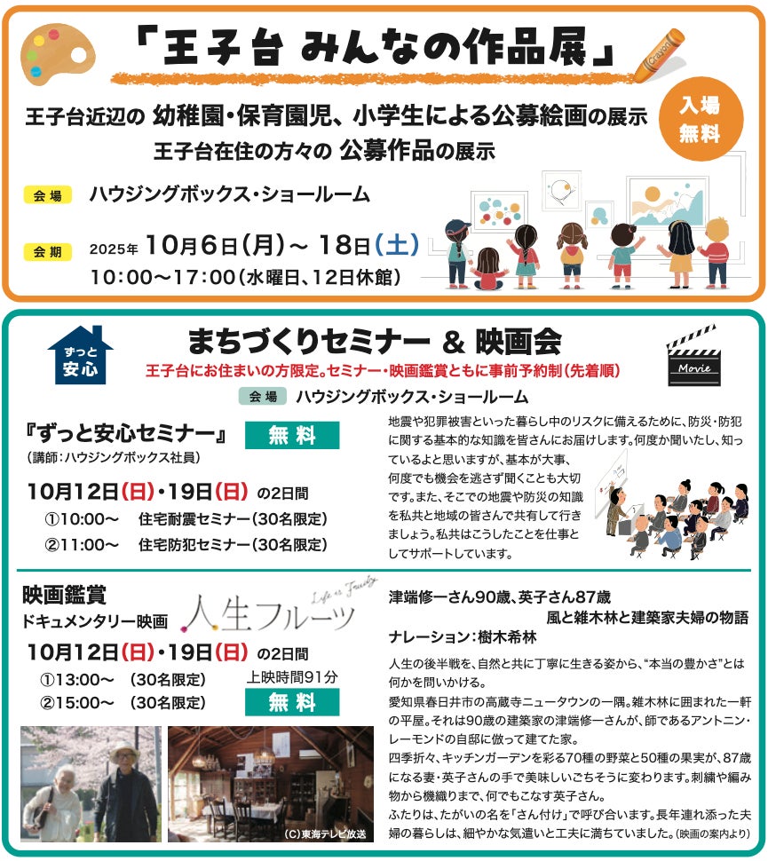 株式会社ハウジングボックス(本社:千葉県佐倉市、代表取締役:村上仁)は、地域の防災・防犯意識を高め、世代を超えた交流を促進することを目的に、「みんなの作品展」と「まちづくりセミナー&映画会」を開催いたします。