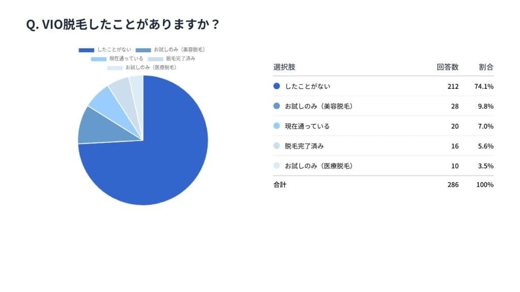 多くの男性はまだVIO脱毛未経験である一方、すでに約15%が実際に脱毛を経験していることが明らかになりました。潜在的なニーズは大きいと考えられます。