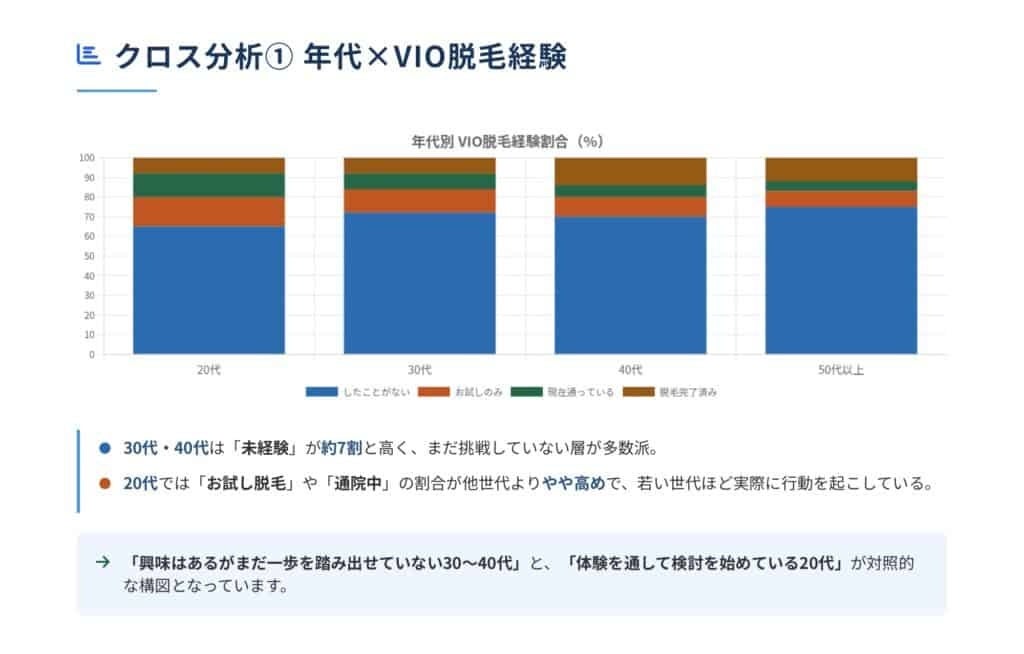 20代では「お試し脱毛」や「通院中」の割合が他世代よりやや高め、若い世代ほど行動的