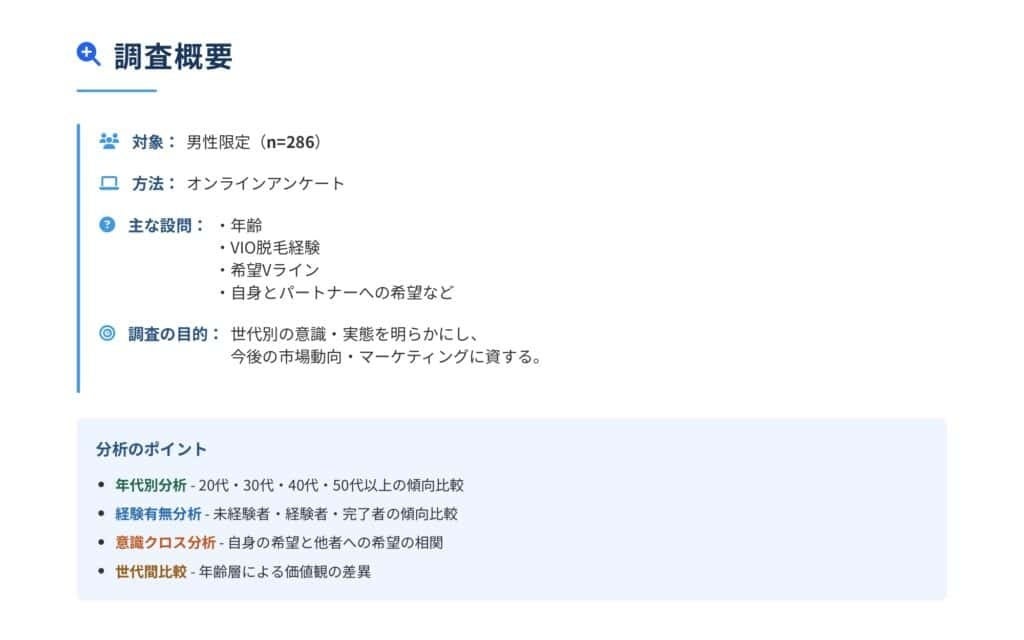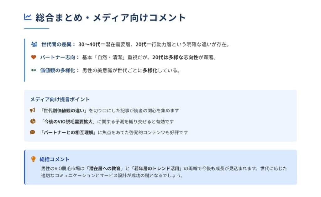 これは、男性美容の一般化とともに、従来タブー視されてきたVIOケアが日常的な身だしなみとして浸透しつつあることを示しています。パートナーに対しても柔軟かつ前向きな意識が広がっており、男女ともに受け入れられる新しいスタンダードが形成されつつあると言えます。