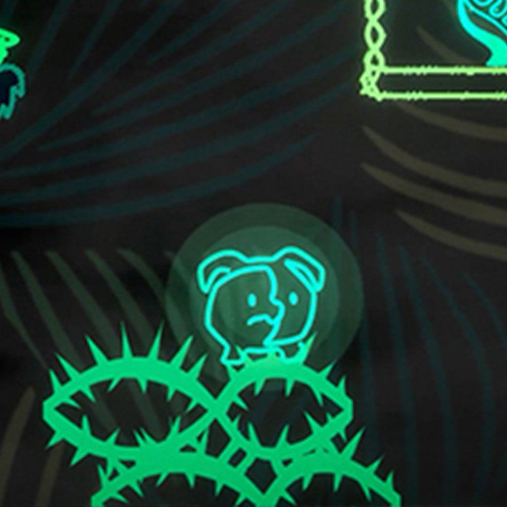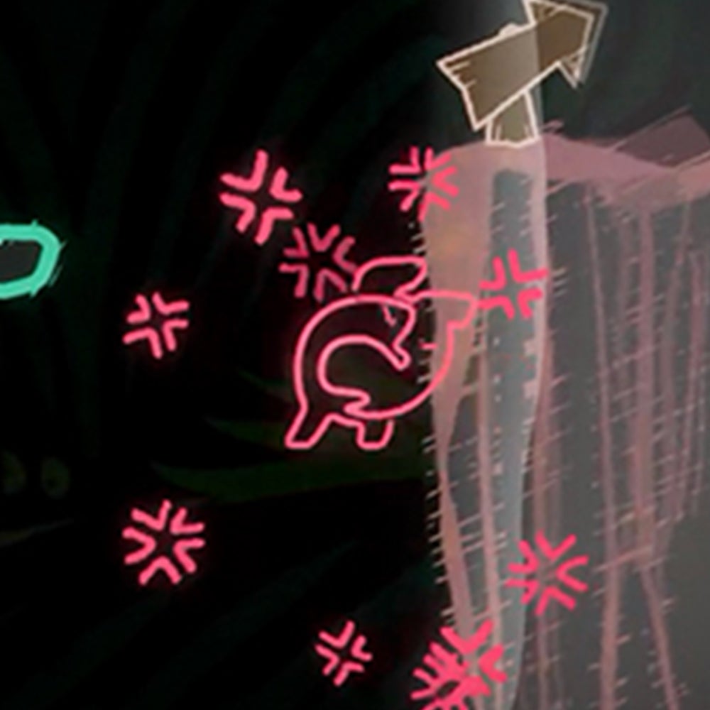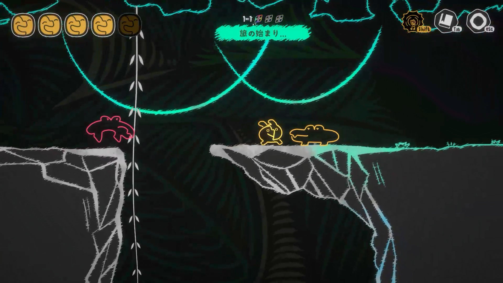 モノは「幸せ」「悲しみ」「怒り」「不安」という4つの感情を司る守護精霊で、ステージ中に生えている「源泉植物」に触れることで、触れた感情に切り替えることが可能です。それぞれの感情には固有の能力が割り振られており、例えば、黄色の「幸せ」なら天にも昇る気持ちとなり、高くジャンプできるようになったり、水色の「悲しみ」なら、しょんぼりして狭いところが通れるようになったりします。また、モノの感情は、他のキャラクターにも伝播させることができ、その感情になったキャラクターはモノと同様に行動パターンが変わります。「怒り」の感情を持つワニは攻撃してきますが、「悲しみ」の感情を持つワニは、モノを上方向に飛ばしてくれます。このように、プレイヤーはモノとキャラクターの感情をうまく切り替えながら、ステージクリアを目指して行きます。