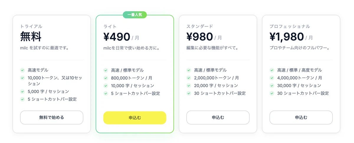 さらに、milcは月額490円から利用できる、他社のサービスと比べて圧倒的に始めやすい価格設定も特長です。毎日使う文章支援ツールだからこそ、機能だけでなく、継続しやすい価格にもこだわりました。