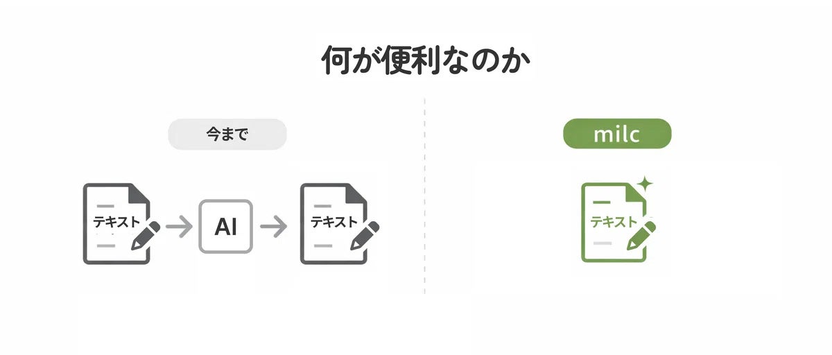 従来、文章を整えるためには、別のツールを開き、テキストをコピーして貼り付け、指示を書き、元の画面に戻るという手間が発生しがちでした。milcは、いま書いている場所で、そのまま編集できることを重視し、文章作業の流れを止めにくい体験を目指して開発されました。