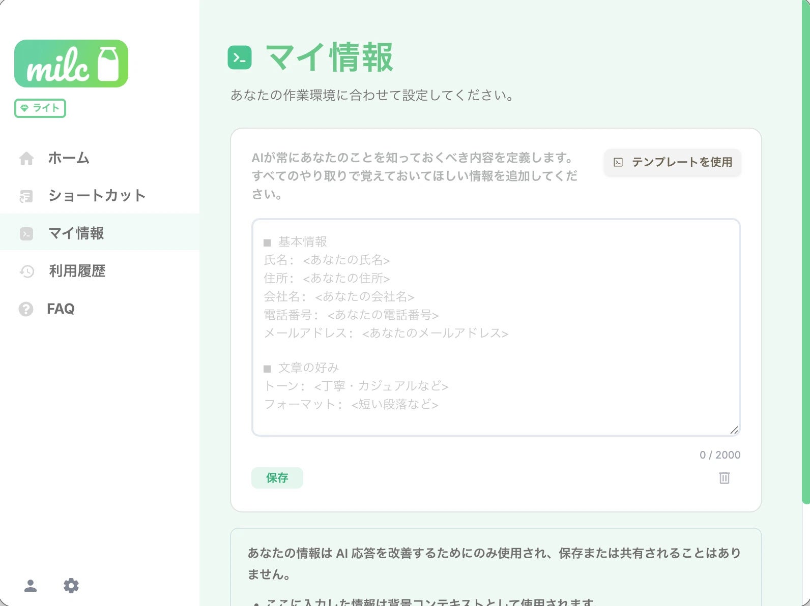 milcには、住所、会社名、連絡先、営業時間、サービス内容、返信時のルールなど、自分の前提情報をあらかじめ持たせやすい「マイ情報」機能があります。これにより、毎回同じ内容を説明し直さなくても、日々の文章作成に自然に反映しやすくなります。
