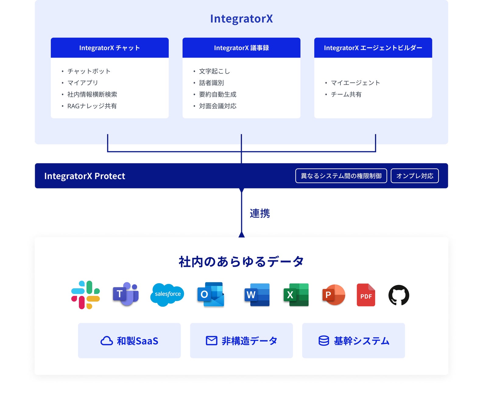 DriveXが開発する「IntegratorX」は、これらの課題を包括的に解決するAIナレッジプラットフォームです。ERP、SaaS、オンプレミスなど多様なシステムと連携し構造化・非構造化を問わず社内外のあらゆるデータをセキュアに一元管理します。