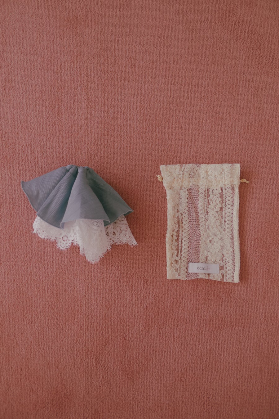 特徴:ウェディングドレスに使われる上質なレースを贅沢に使用。普段使いできる「シュシュ」と「巾着」に仕立てることで、廃棄予定だった布に再び命を吹き込みます。