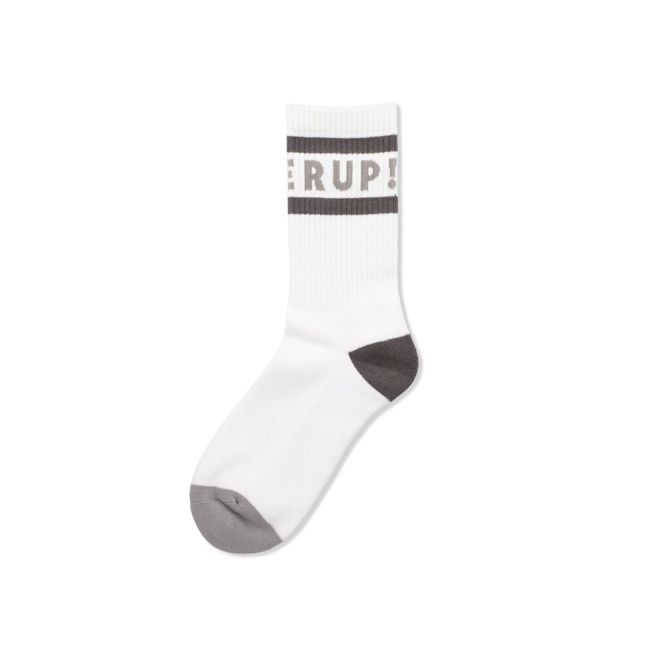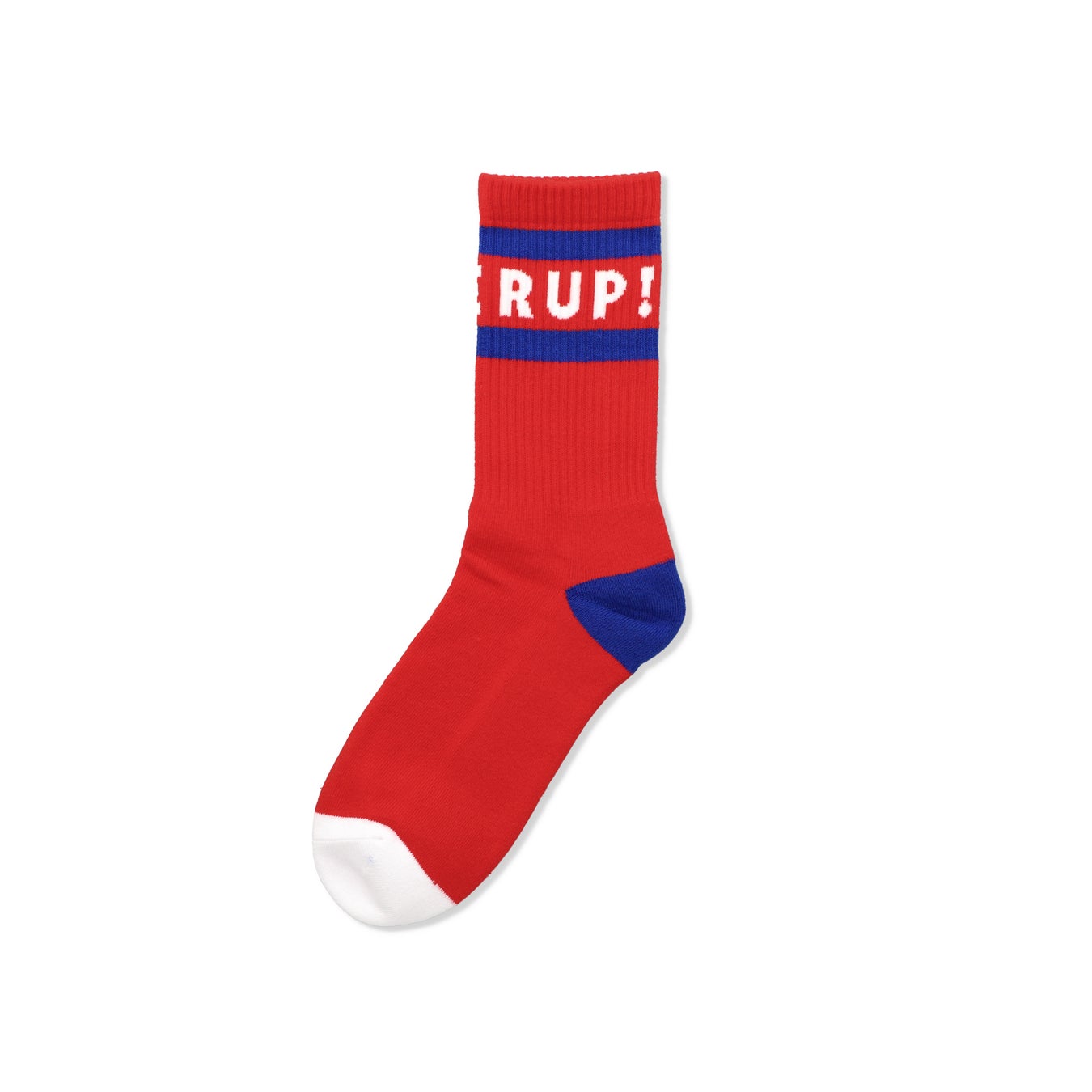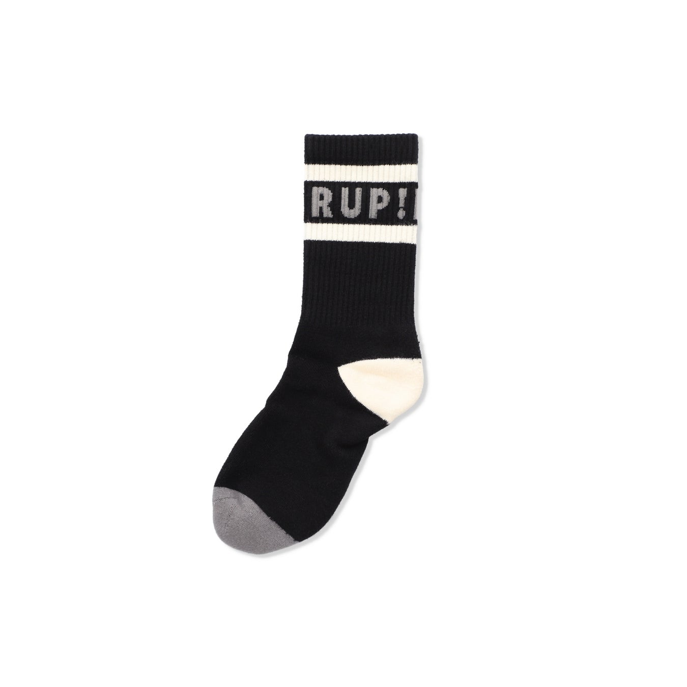 高級コーマ綿糸を使用したクルー丈のリブ編みソックス。キャッチーな「POWER UP!」のグラフィックをジャカード編みで表現しています。