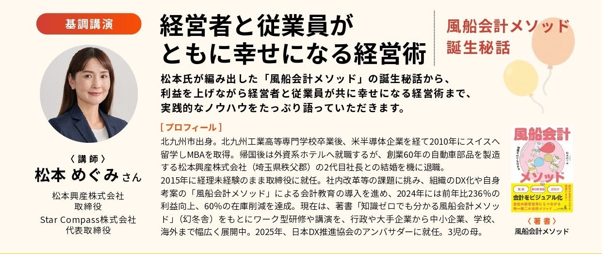 基調講演では、埼玉県秩父郡の松本興産株式会社の取締役である「松本めぐみ」さんをお招きし、『経営者と従業員がともに幸せになる経営術』と題して、松本さんが編み出した『風船会計メソッド』の誕生秘話から、利益を上げながら経営者と従業員が共に幸せになる経営術に行き着いた内容をお話しいただきます。