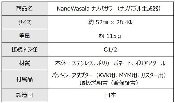 「NanoWasala(ナノバサラ)」は業務用に開発された優れた技術を担保しながら、シャワー用として洗練されたデザインにアレンジしたナノバブル生成器で、生成するバブルは0.001mm未満※1の「ナノバブル」のみです。※2マイクロバブルより小さいナノバブルを高速で作り出し、高効率洗浄・浸透・植物の成長促進など、日々の生活に様々な効果をもたらします。一般家庭だけでなく、ヘアサロン、ペットサロン、宿泊施設などプロの現場でも導入されています。