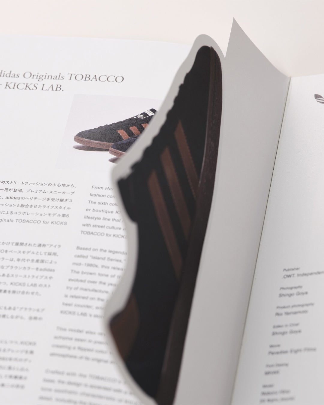 東京・原宿 ── 日本のストリートファッションの中心地から生まれた一足。プレミアムスニーカーブティックKICKS LAB.と、adidasのヘリテージを受け継ぐライフスタイルラインadidas Originalsによるコラボレーション第6弾、それが<adidas Originals TOBACCO for KICKS LAB.>である。