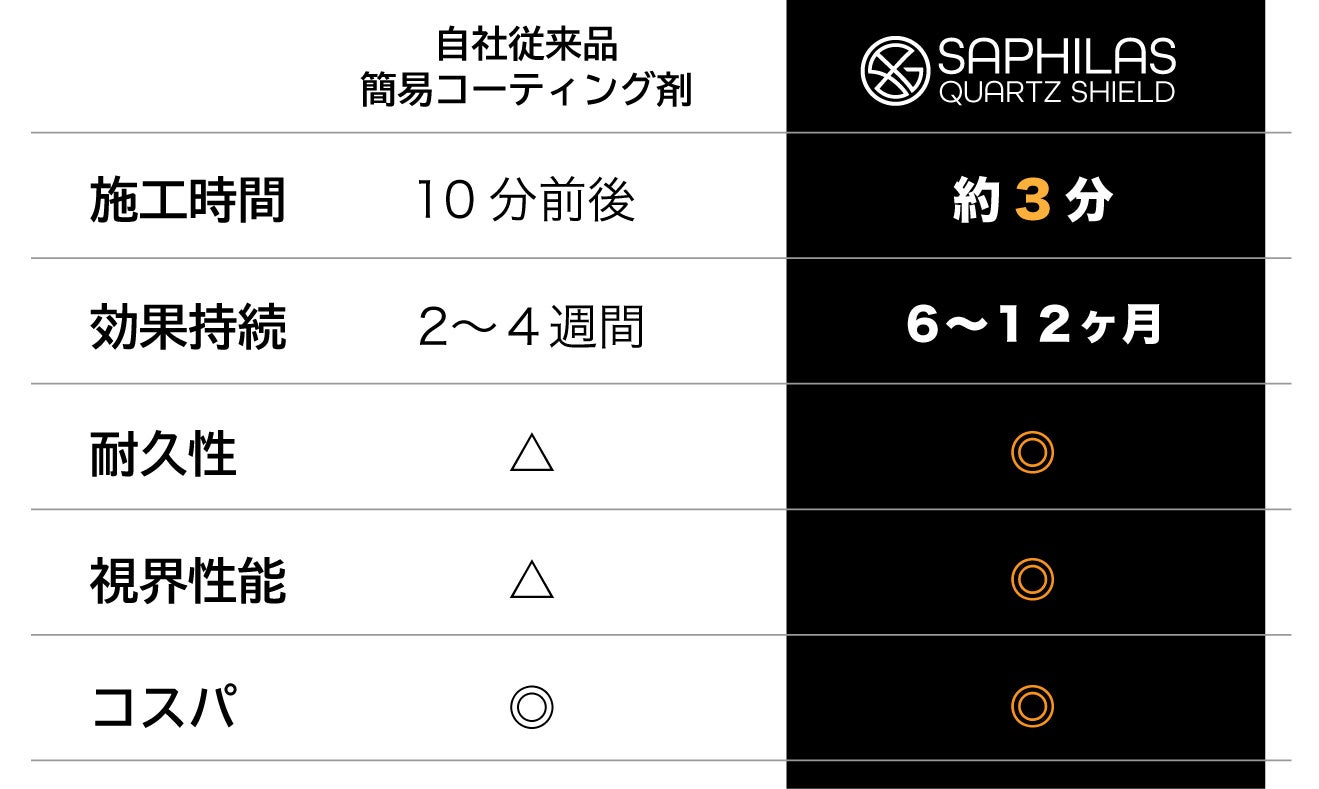 従来の撥水剤やコーティングはシリコンやフッ素を基盤とした“異物の膜”でした。しかし「SAPHILAS クォーツシールド」は、ガラスと同じケイ素由来成分をベースにした特殊シラン化合物を用い、分子レベルでガラスと結合。ガラス表面に「もう一枚のガラス層=オーバーガラス」を形成することで、これまでにない耐久性・透明度・撥水性を同時に実現しました。