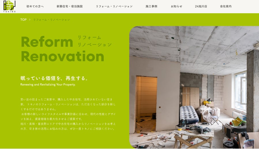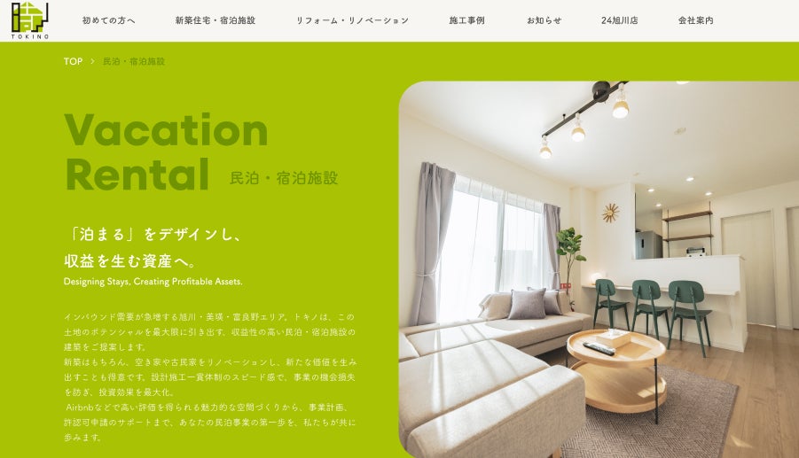 株式会社トキノは、北海道の美しい景観エリアである旭川、富良野、美瑛を中心に、お客様の多様なニーズに応える注文住宅、空き家や古民家を再生へ導くリフォーム・リノベーション、収益性を追求した民泊施設の建築を提供しています。