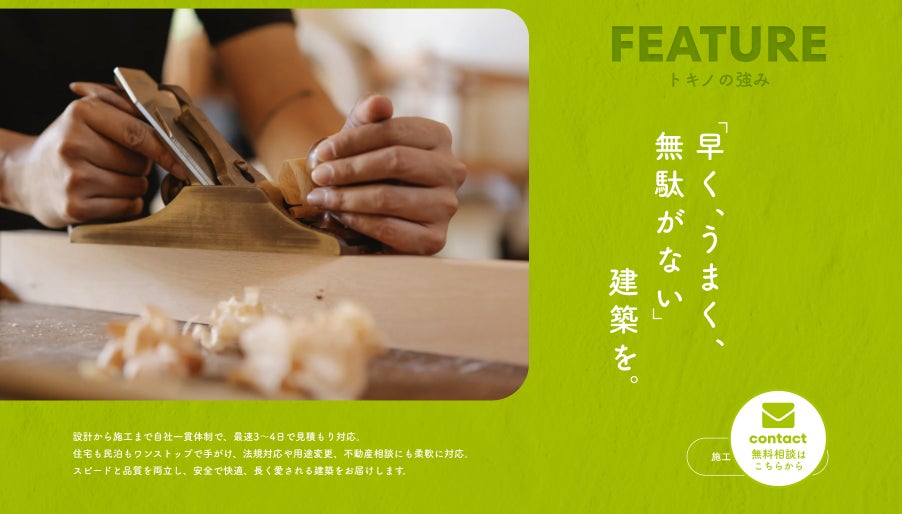弊社の施工のこだわりをお伝えする「施工の特徴」ページ。こちらについても大幅な修正を実施いたしました。