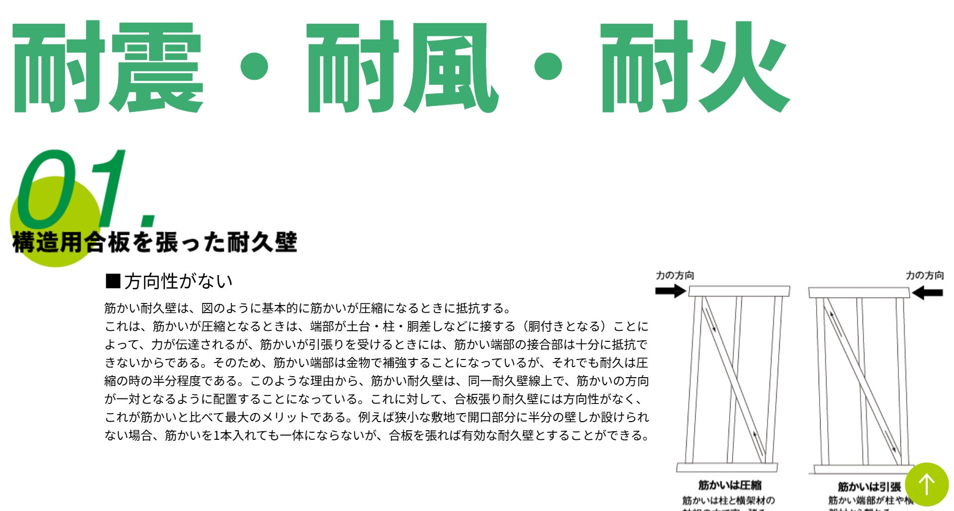 従来の「施工の特徴」ページでは、「断熱」「耐震・耐風・耐火」「防腐・防蟻予防」という機能面に即したカテゴリー分けに基づき、図を用いたガラスの断熱性能の説明や住宅の断面図を用いた耐火構造住宅の説明などが続きます。詳細な説明がなされている分、施工に関する専門用語が多く用いられており、一般の人にとっては難しい内容となっていました。