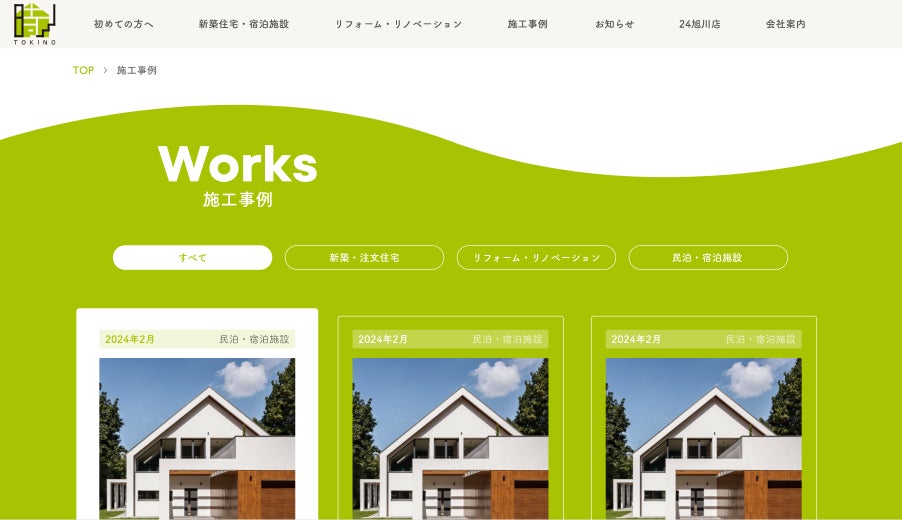 弊社が実際に設計・施工を担当した事例を最新順にご紹介する施工事例ページ。「新築・注文住宅」「リフォーム・リノベーション」「民泊・宿泊施設」と、カテゴリー別に表示できるのも便利です。