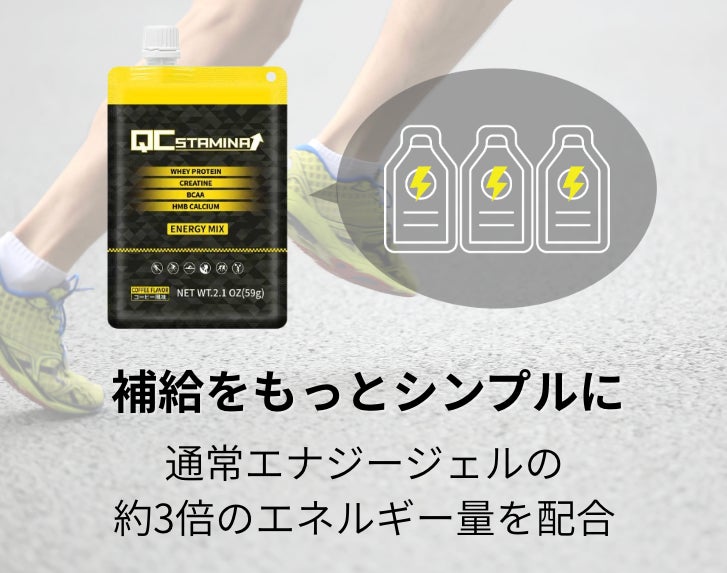 『QC STAMINA』は、従来のエナジージェルよりも多くのエネルギーを摂取できるように配合された、新しいスタイルの補給食品です。従来のエナジージェルでは、持ち運ぶ量や補給の頻度が多くなることが課題でした。『QC STAMINA』はその点に着目し、しっかりとエネルギーを補給できるよう開発されています。従来のエナジージェルと比べて、約3倍のエネルギー量を摂れる配合となっており、長時間の運動をサポートします。