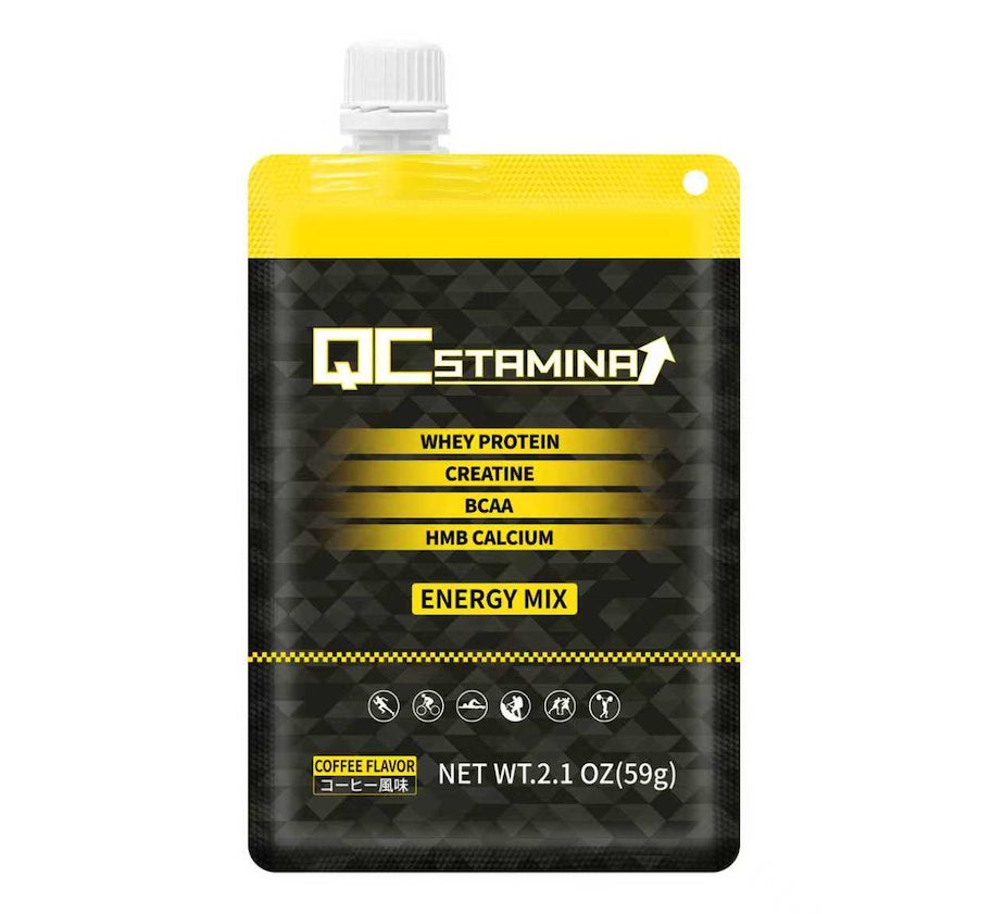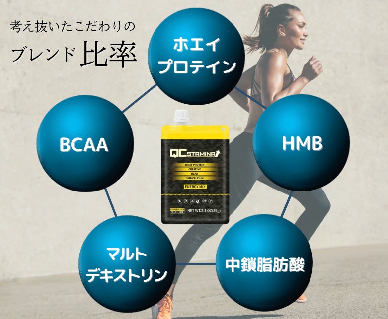 『QC STAMINA』は、従来の糖質中心のエナジージェルとは異なり、5つの成分を配合した新しいスタイルのエネルギー補給です。糖質の補給としてのマルトデキストリンに加え、「糖質に近い第二のエネルギータンク」として働く中鎖脂肪酸を配合することで、長時間の運動をしっかりサポートします。さらにホエイプロテインやBCAA、HMBを配合することで、長時間にわたるスポーツにおいて力強い運動を支えます。