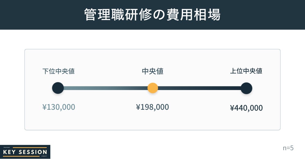管理職研修の費用の中央値は198,000円です。下位20%の中央値は130,000円、上位20%の中央値は440,000円となっています。