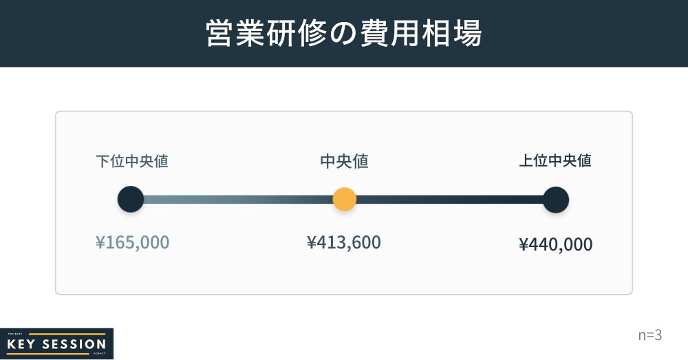 営業研修の費用の中央値は413,600円となりました。下位20%の中央値は165,000円、上位20%の中央値は440,000円となっています。