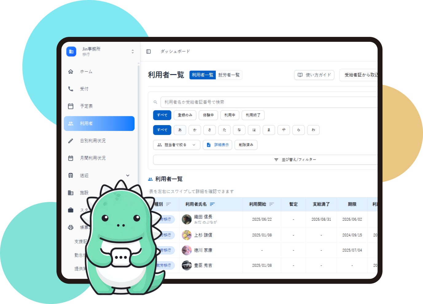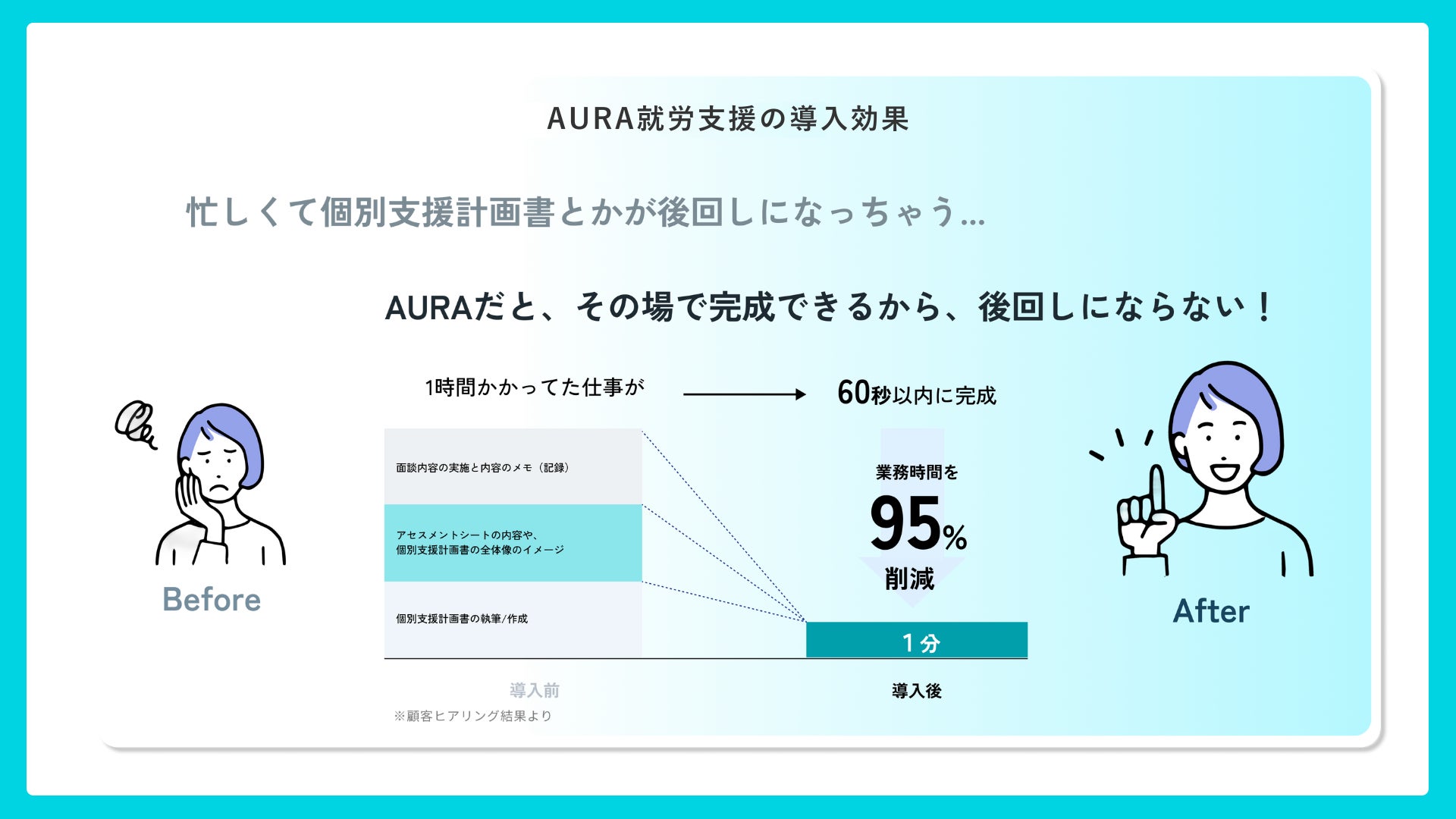 Jinは、就労支援施設向けの福祉AI「AURA就労支援」を2025年6月より提供しており、書類作成業務を中心に大幅な業務効率化を支援し、「業務をもっとラクに、利用者はもっと笑顔に」を実現しております。相談支援業務でも、面談記録・書類作成のAIアシスタントを中心に様々な事務作業をオールインワンでサポートし、相談員が1人でも多くの方に「相談支援」を届けられる仕組み作りをスタートいたします。