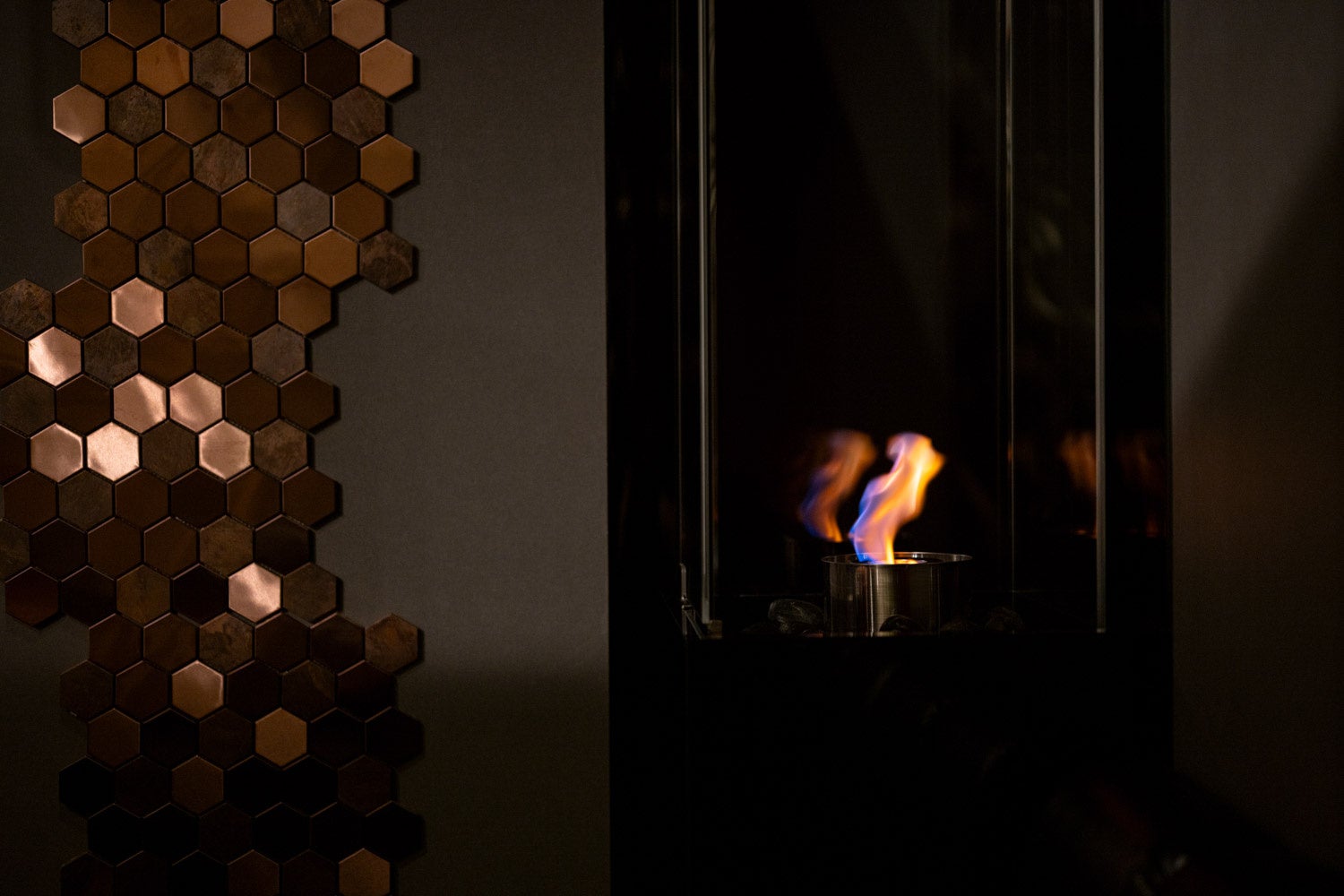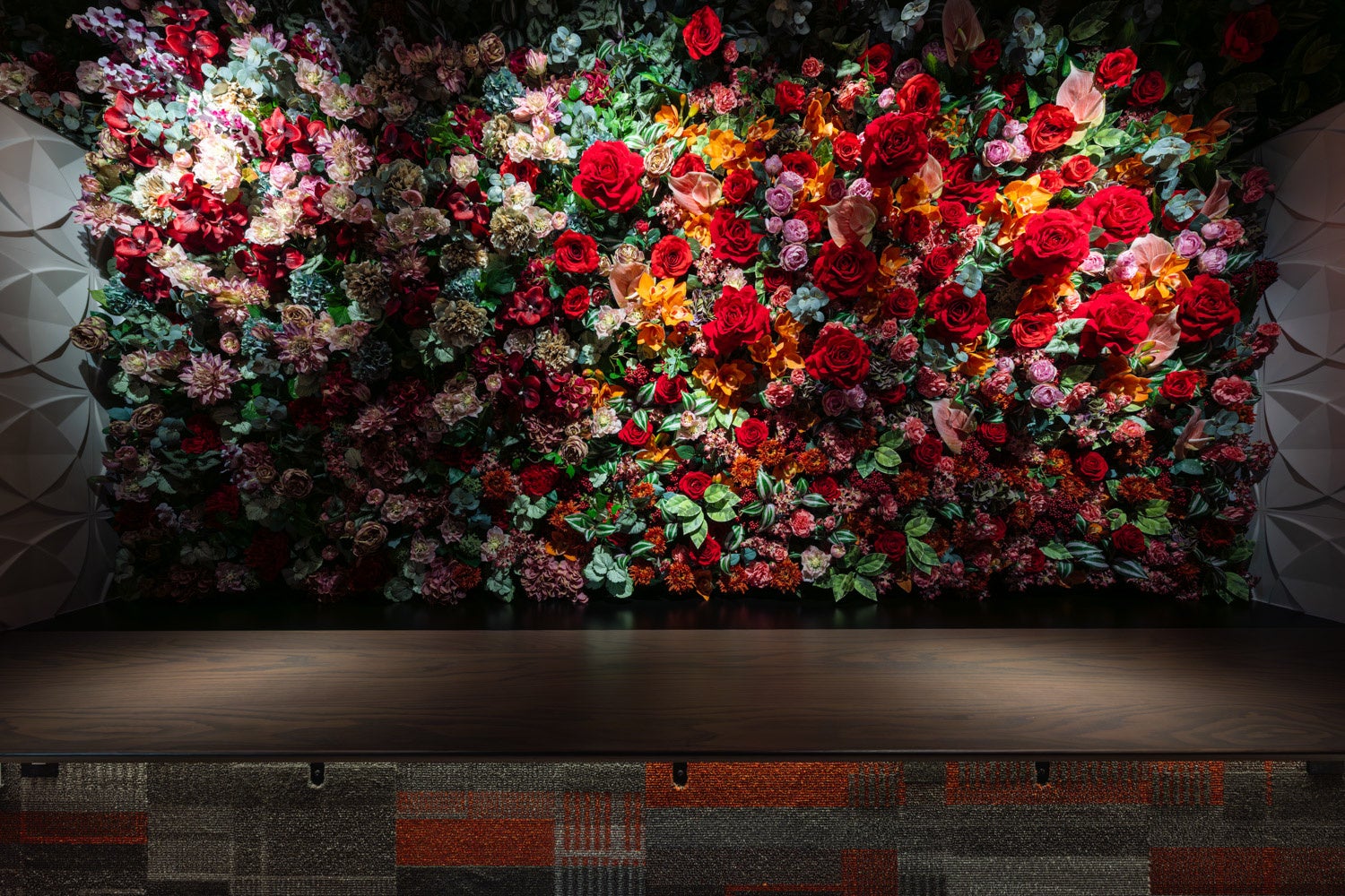 座る席からはテーブルごとに違った演出を楽しめます。焚き火のような炎、一面に拵えた花、滝のように流れる水。全席半個室で、安心して語らいを楽しめます。