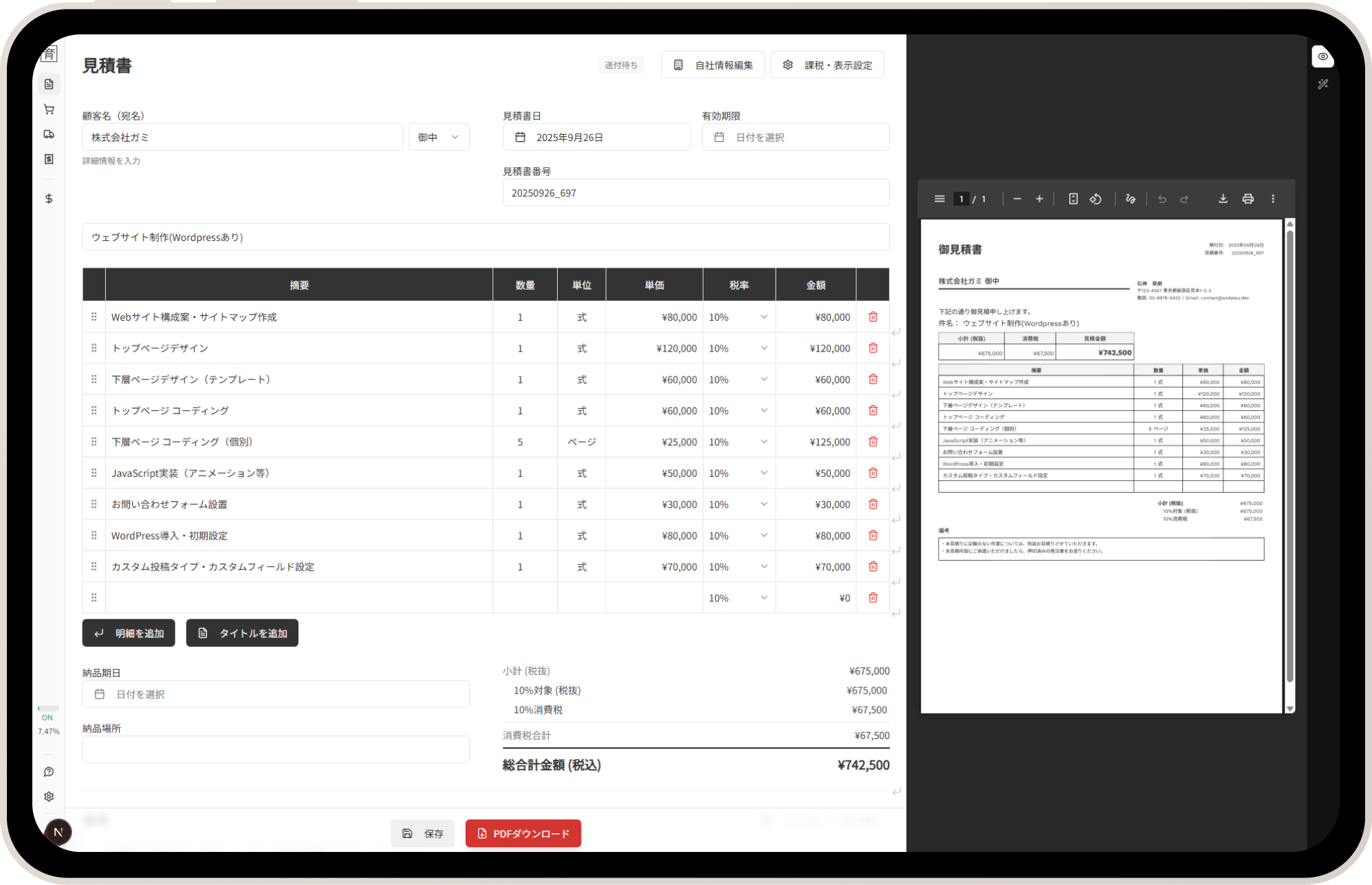 確定した見積から発注書や納品書、請求書へ自動変換し、書式や税処理の整合性を維持します。ミスや重複入力を削減し、プロジェクトの進行に合わせてステータス管理が可能です。