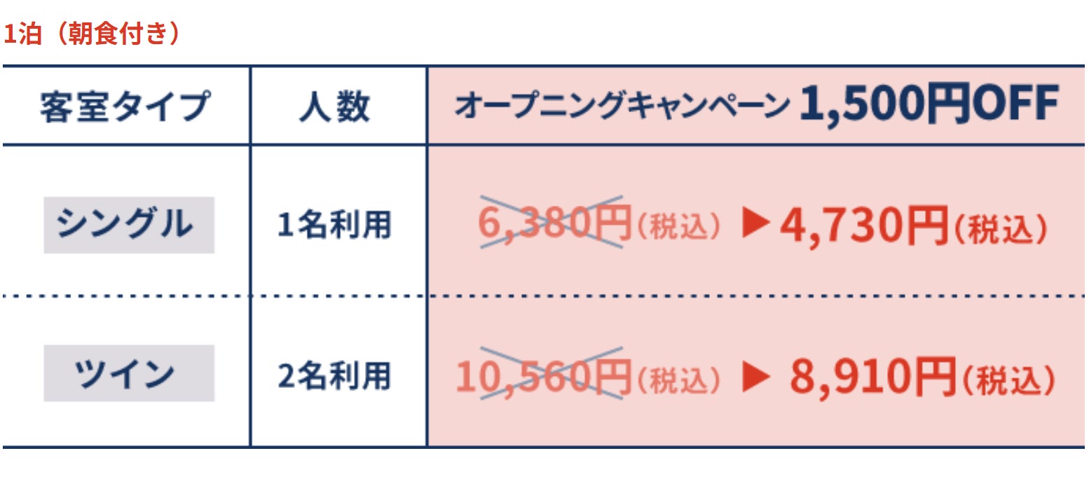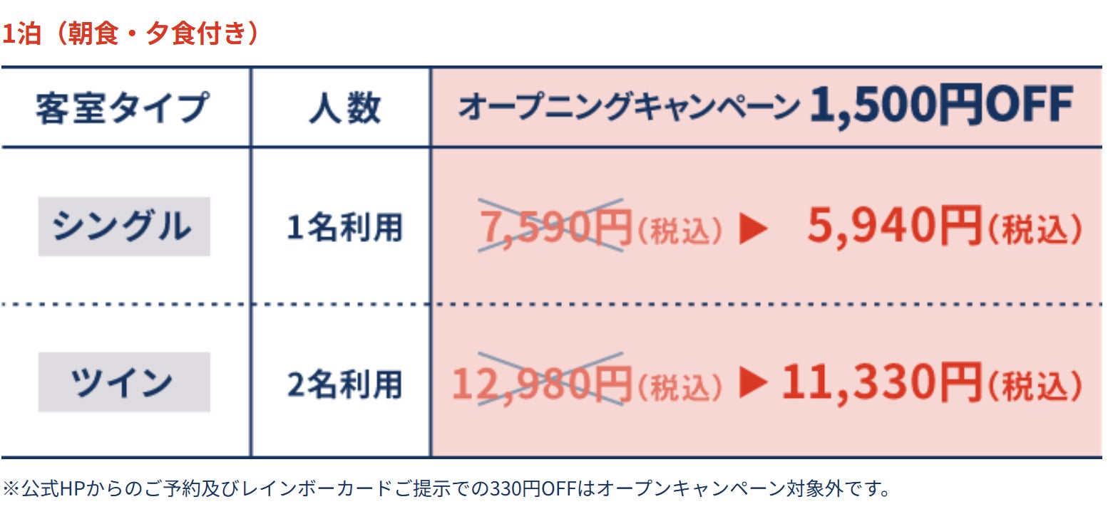 2025年11月1日(土)から11月30日(日)までの期間限定で、「オープニングキャンペーン」を実施いたします。期間中は、1室あたり通常料金より 1,500円(税抜)割引 にてご宿泊いただけます。