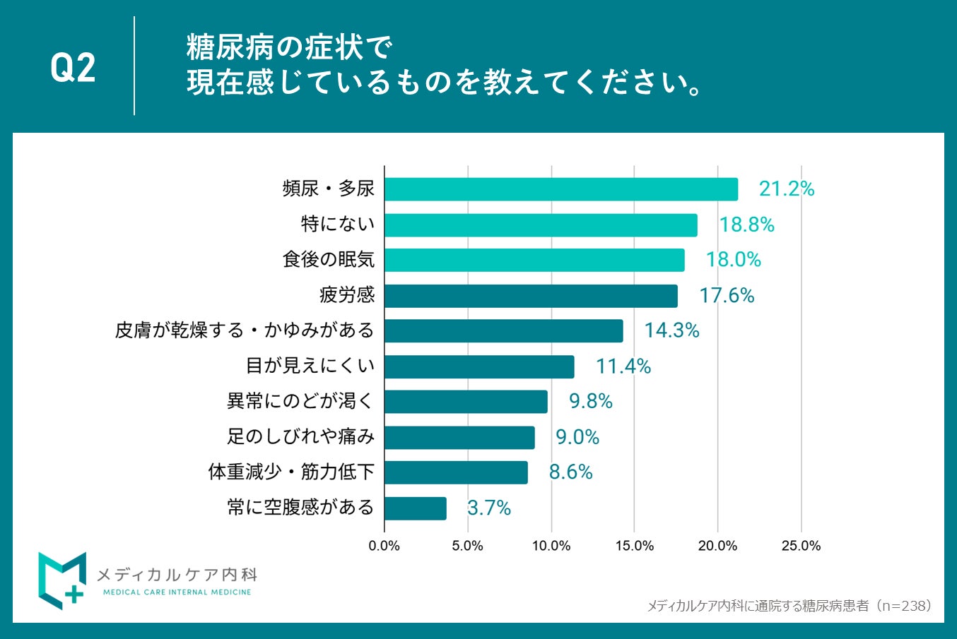 「頻尿・多尿」(21.2%)を筆頭に「食後の眠気」(18.8%)「疲労感」(18.0%)などQOLを蝕む症状で悩む現実。しかし、患者の約2割は「特に症状はない」と回答。