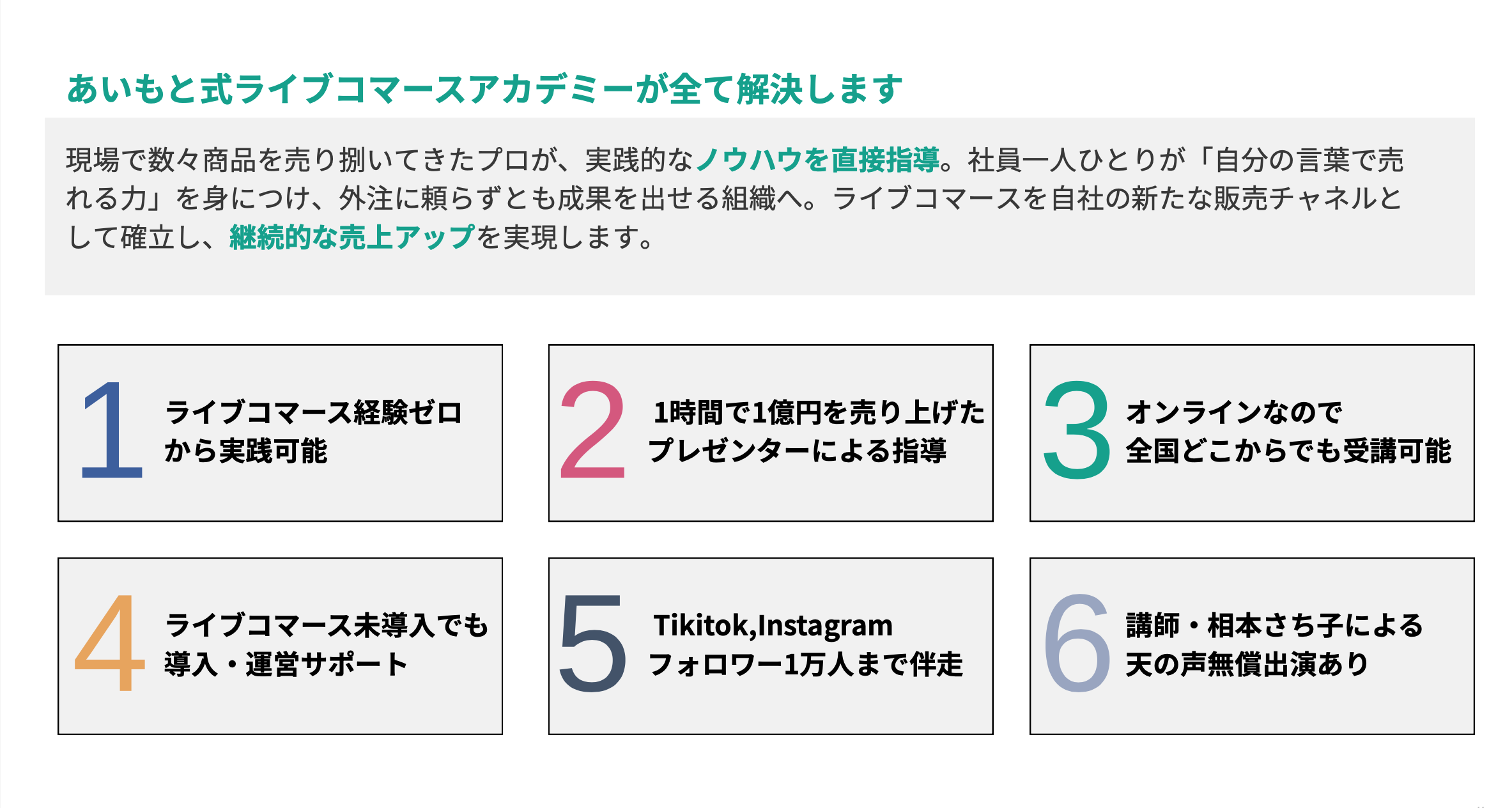 こうした課題に対し、「あいもと式ライブコマースアカデミー」は
