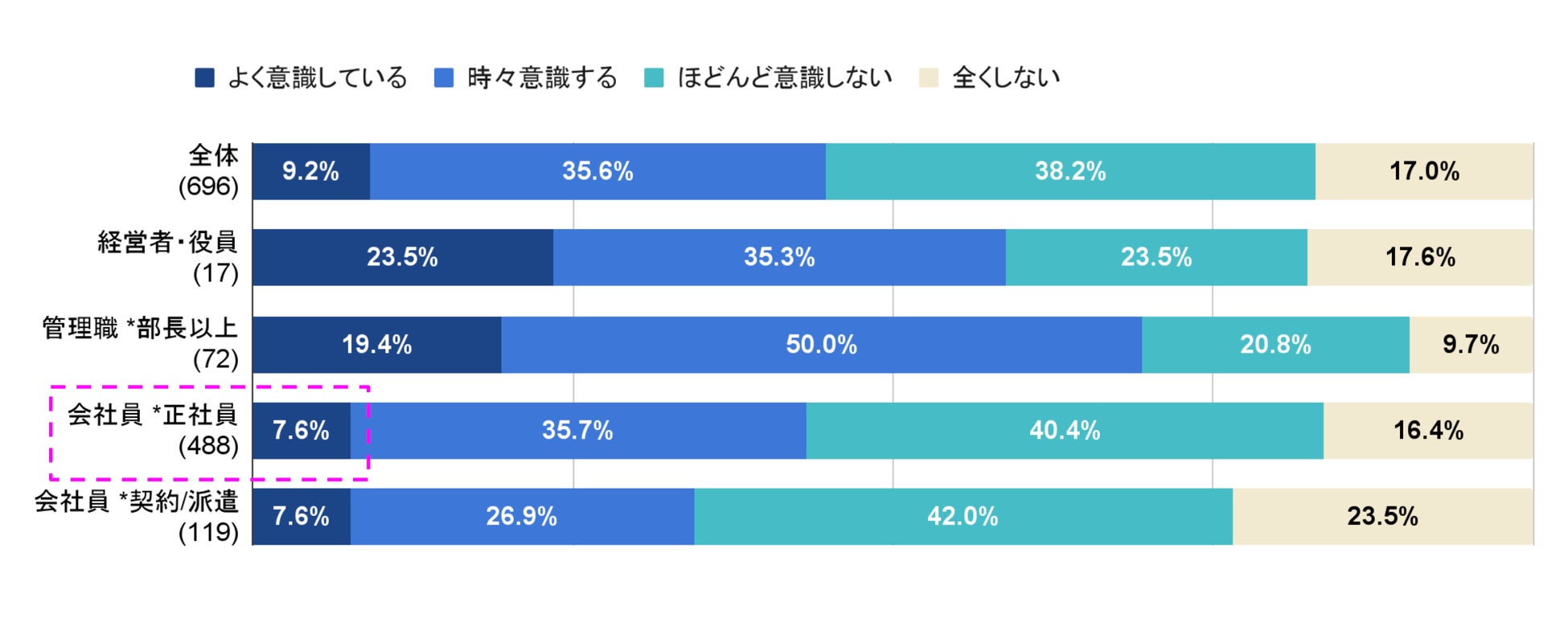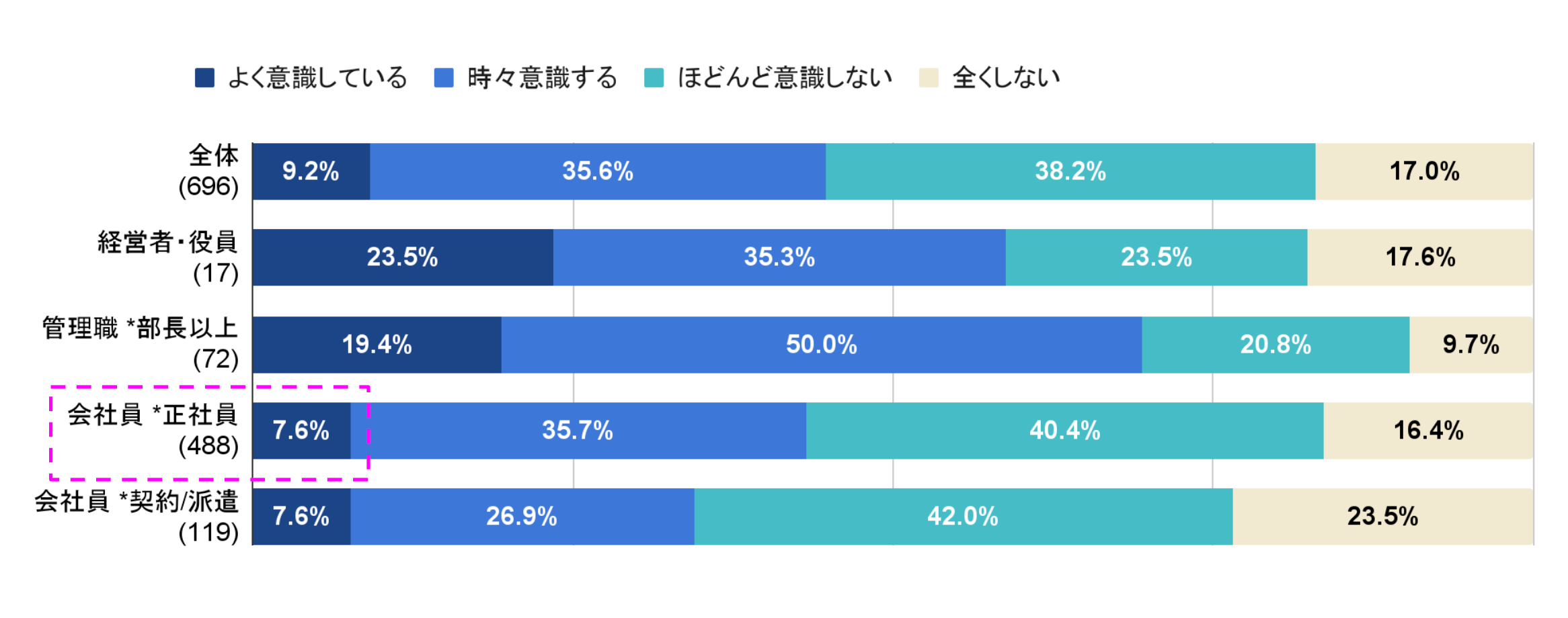 理念の認知度は職位間で格差が見られました。経営層・管理職の40.3%が「はっきり覚えている」と回答したのに対し、正社員の確実認知層は14.3%まで低下します。