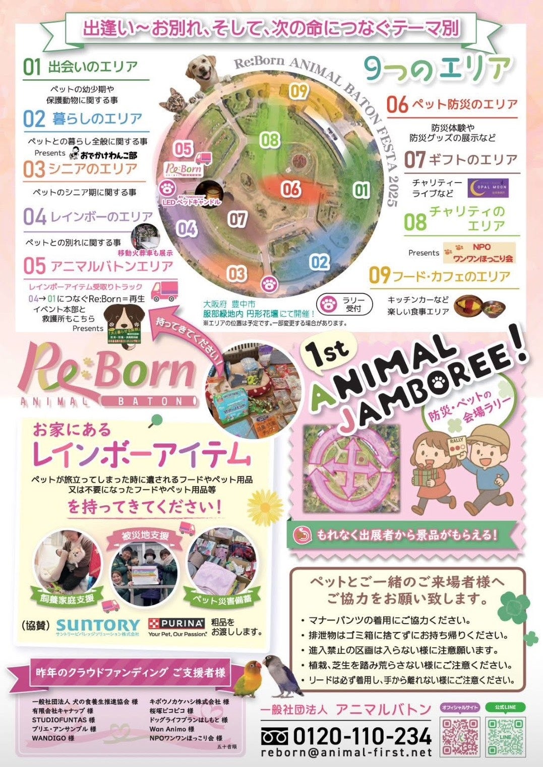 エリアとしましては、01.出会いのエリア、02.暮らしのエリア、03.シニアのエリア、04.レインボーのエリア、05.アニマルバトンのエリア、06.ペット防災のエリア、07.ギフトのエリア、08.チャリティのエリア、09.キッチンカーのエリアの9つとなります。