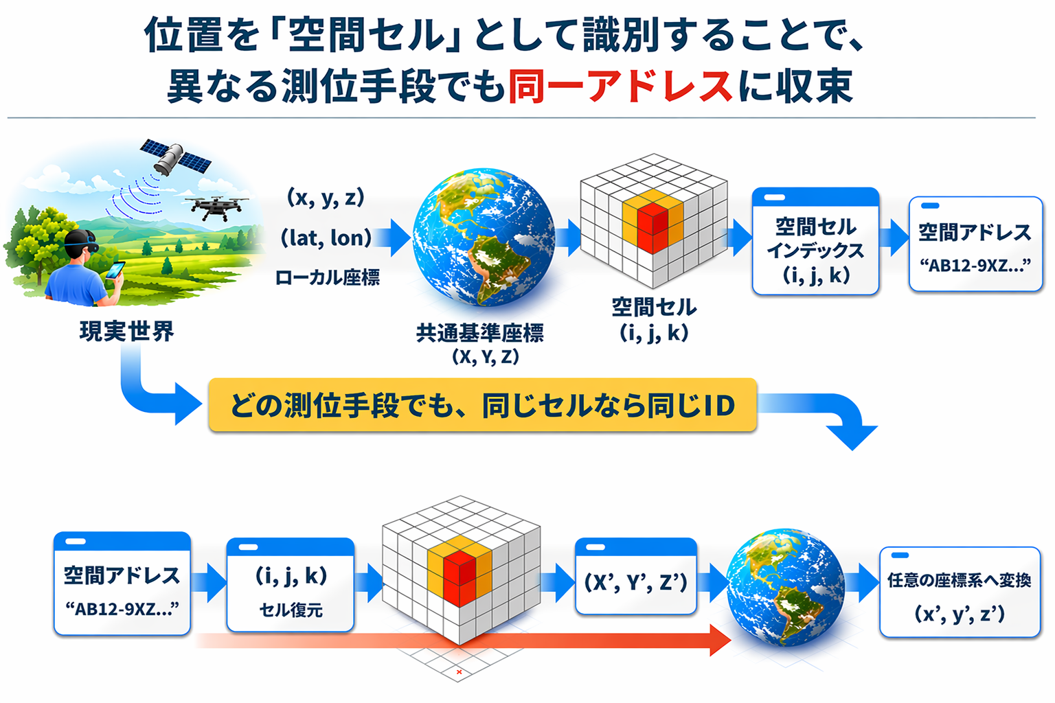 本構想は、異なる測位手段(GNSS・SLAM等)で取得された位置情報を同一の識別子に正規化することで、屋内外を問わず「同じ場所」を同じIDで扱えるようにするものです。