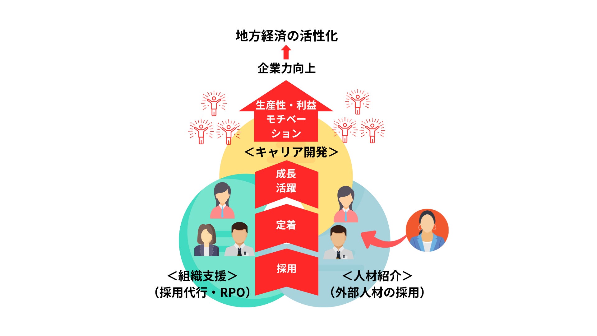 人材紹介業のコンサルタントとして従事してきた代表は、「採用を通じて地元の活性化に貢献したい」という想いで広島へUターンし、地方中小企業が成長・活性化するには外部採用に加えて「組織内面からの底上げ」が不可欠であることに着目しました。採用業務専任者の不在や育成・評価の仕組み不足など、採用“以外”の課題に関しても一気通貫で対応することで、「採用する力」と「活躍し続ける力」を同時に高め、企業力向上に貢献します。都心と地方、企業と人を繋ぐ橋渡しとして、持続的な地域経済の活性化を目指してまいります。