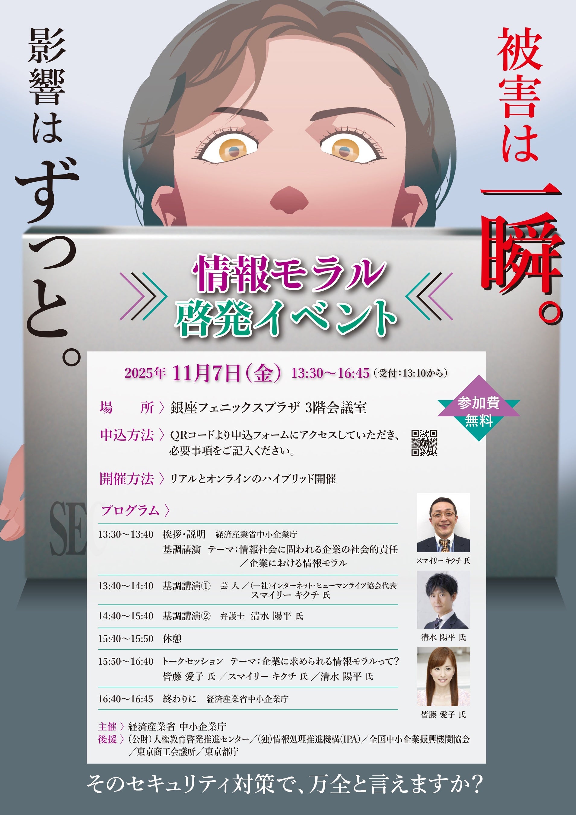 経済産業省 中小企業庁は、企業が情報を取り扱うに当たって求められる考え方とその行動(情報モラル)について発信し、健全な経済活動の促進を図るため、「情報モラル啓発イベント ー著名人と情報モラルを学ぼうー」を2025年11月7日(金)に開催します。