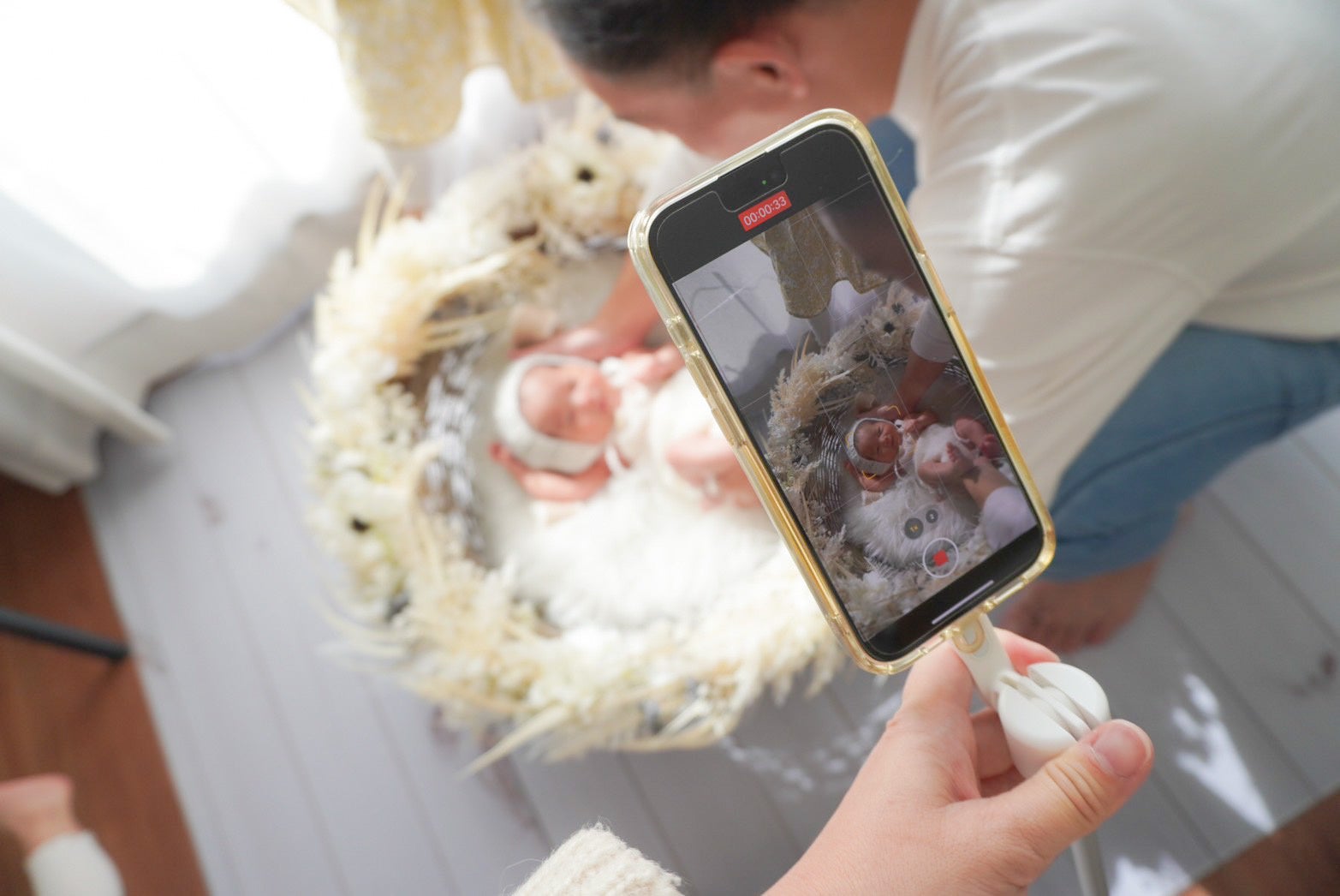 たとえば、小さな手足にそっと衣装を着せる時間。授乳しながら、赤ちゃんのぬくもりを感じるひととき。スマートフォン越しに、その一瞬一瞬を残そうとする瞬間。お母さんが赤ちゃんをあやし、おじいちゃんとおばあちゃんが光の入り方を見て、お父さんが「今だね」とシャッターを切る。そのひとつひとつが、家族みんなで「今この瞬間」を分かち合い、形にしていきます。