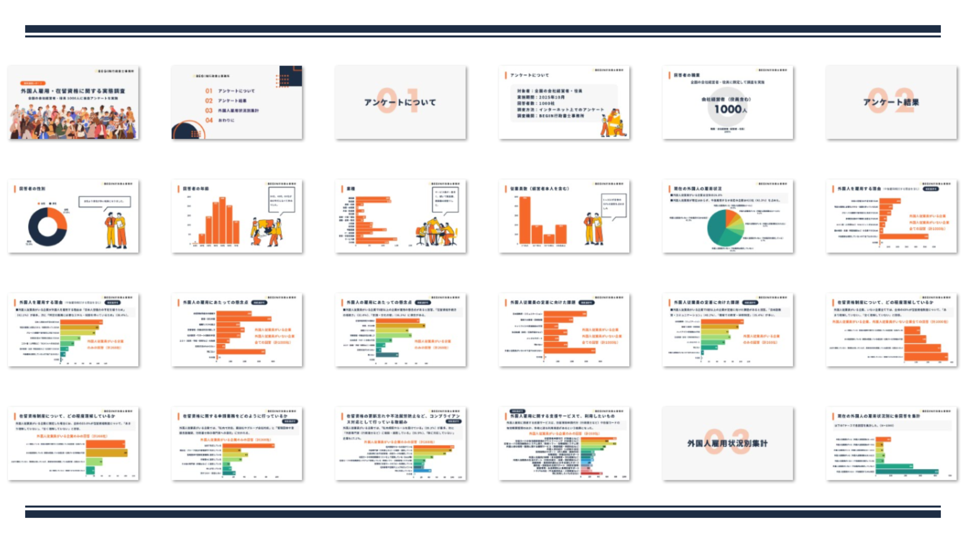 本レポートでは、BEGIN行政書士事務所が独自に実施したアンケート調査(全国の会社経営者・役員1,000人対象)をもとに、外国人雇用や在留資格制度の現状・課題・今後の支援ニーズを明らかにしました。