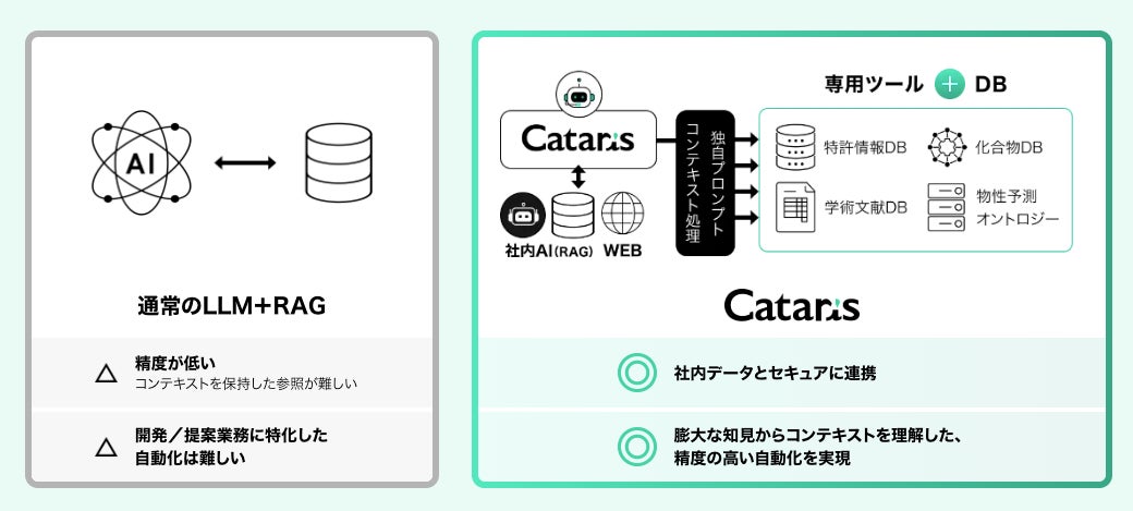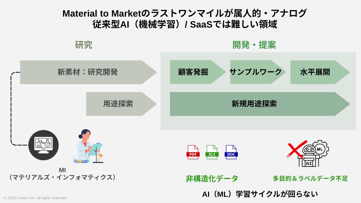 従来、素材の新規用途探索や改良提案は、研究者や営業担当者の経験や属人的な知識、あるいはローラー型営業などのアナログ手法に依存しており、「探索スピード」と「提案の再現性」の両立が難しいという課題がありました。さらに “Material to Market” のラストワンマイルは、非構造データ中心/多目的判断/結果ラベルの希少・遅延という構造的理由から、従来の機械学習や一般的なSaaS(Software as a Service)では解きづらい領域でした。Catarisは、これらの課題をAIエージェントによる自動解析と提案生成で解決します。