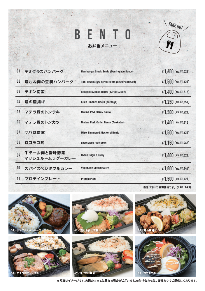 食事メニューの一部は、テイクアウトのお弁当として販売します。また、UBERのデリバリーサービスを通じて、ご自宅にいながらFLUX CAFEの食事を味わうこともできます。