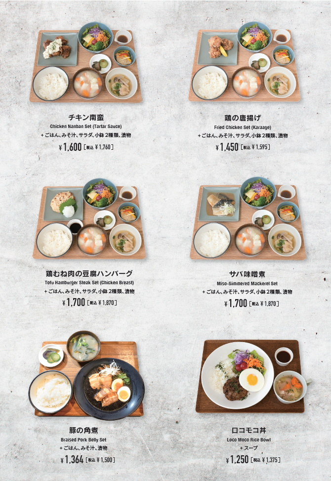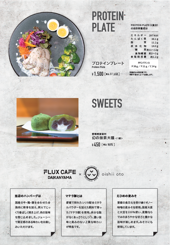 日本人にとって理想的な栄養バランスといわれる「一汁三菜」の定食を中心に用意している食事メニューは、毎日食べたくなる手作りならではのおいしさです。オイシイオトの弁当の中でも人気が高い炭火焼きのデミグラスハンバーグ、鶏の唐揚げ、チキン南蛮をはじめ、FLUX CAFE 代官山店限定のメニューも登場。愛媛県宇和島市が発祥の郷土料理である鯛めしは、鯛の刺身に特製の醤油ダレと生卵、薬味を混ぜ合わせ、温かいご飯にのせて食べる漁師飯です。また、FLUX CAFE 代官山店のカラダを気遣うお客さまに向けて、鶏むね肉の豆腐ハンバーグもご用意しました。タンパク質をしっかり摂りながらもヘルシーなメニューです。