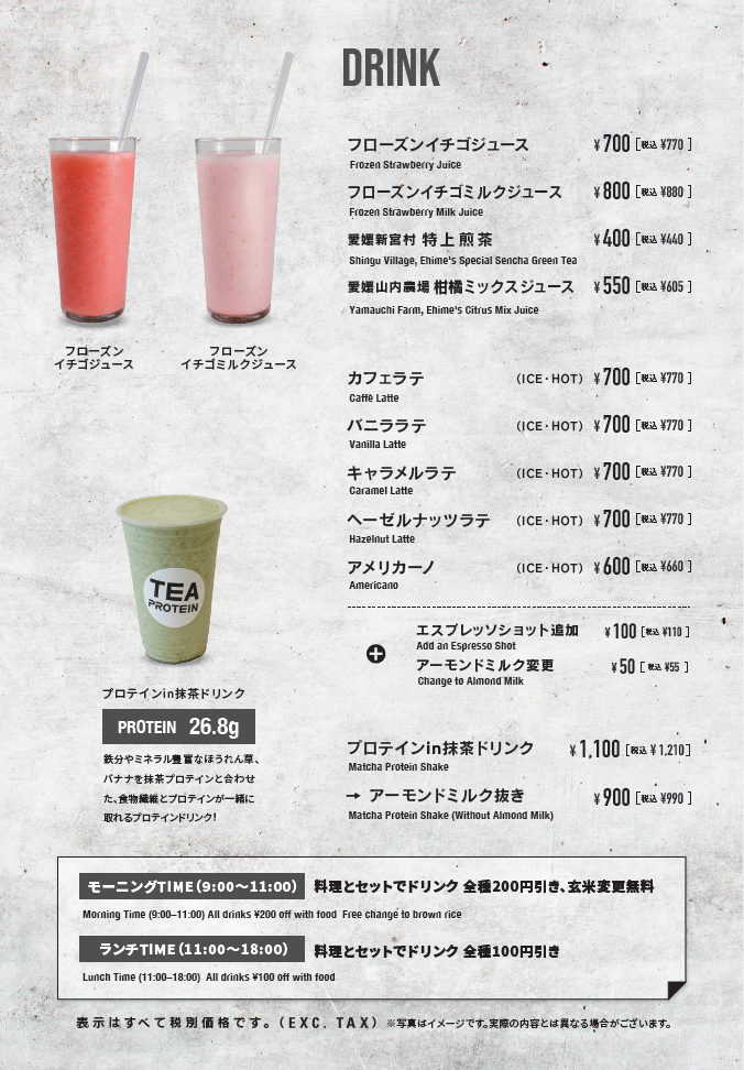 ジム帰りのお客様におすすめの、鶏のむね肉、ブロッコリー、ゆで卵などを組み合わせたプロテインプレートや、抹茶味のプロテインにバナナ、ほうれん草、ブルーベリー等を加えたプロテインin抹茶ドリンクもご用意しています。