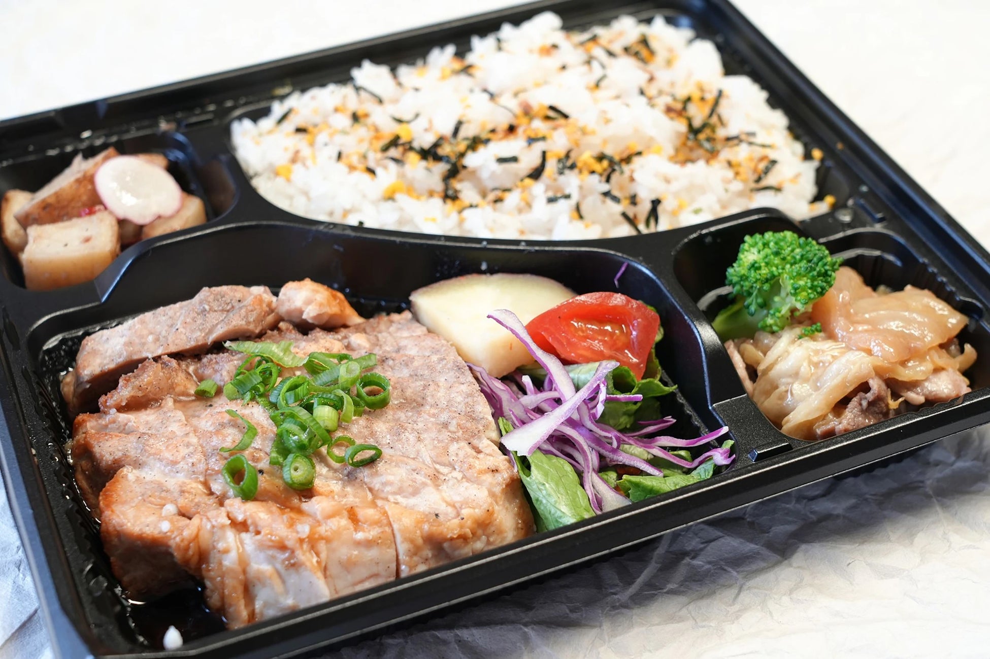 マテラ豚のトンテキ、マテラ豚のとんかつは、愛媛の弁当でも人気のメニュー。マテラ豚とは、愛媛で採れたシリカ配合ミネラルパウダーを飼料に配合して育てられた豚です。余分な脂分がなく、あっさりしているのに、しっかりとした旨味を感じられます。