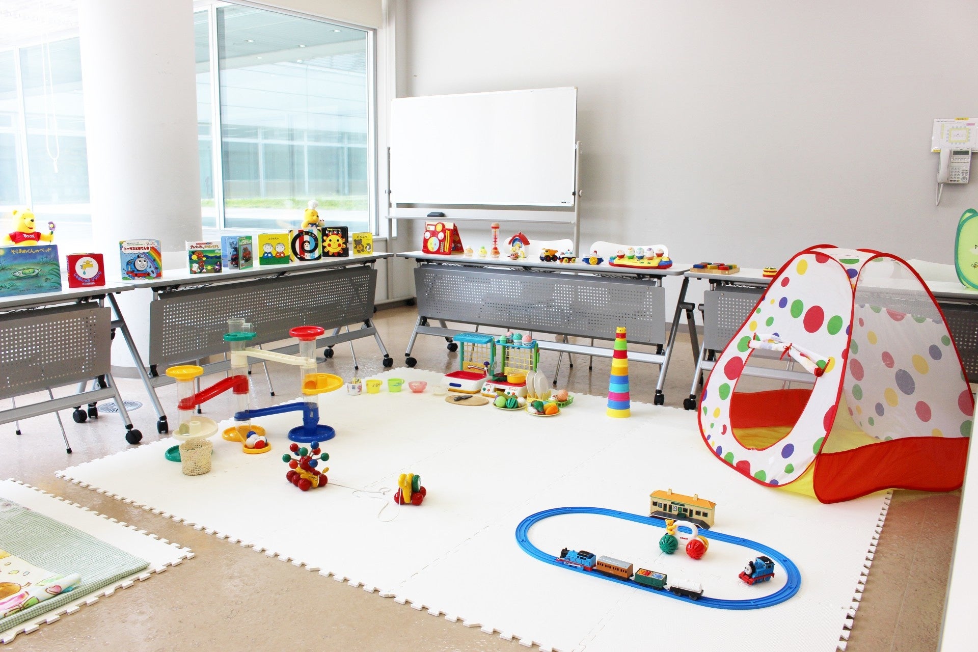 伝承遊び(あやとり・折り紙)、工作、絵本の読み聞かせ、玩具(プラレール・ままごと・知育グッズ)など、年齢や興味に合わせた遊びを提供。
