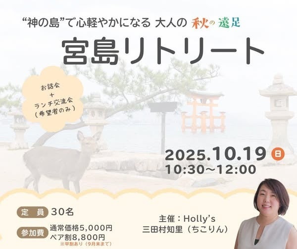 広島を拠点にママ向けカウンセリングを提供する Holly’s(ホリーズ) は、2025年10月19日(日)、宮島で「宮島リトリート」を開催します。