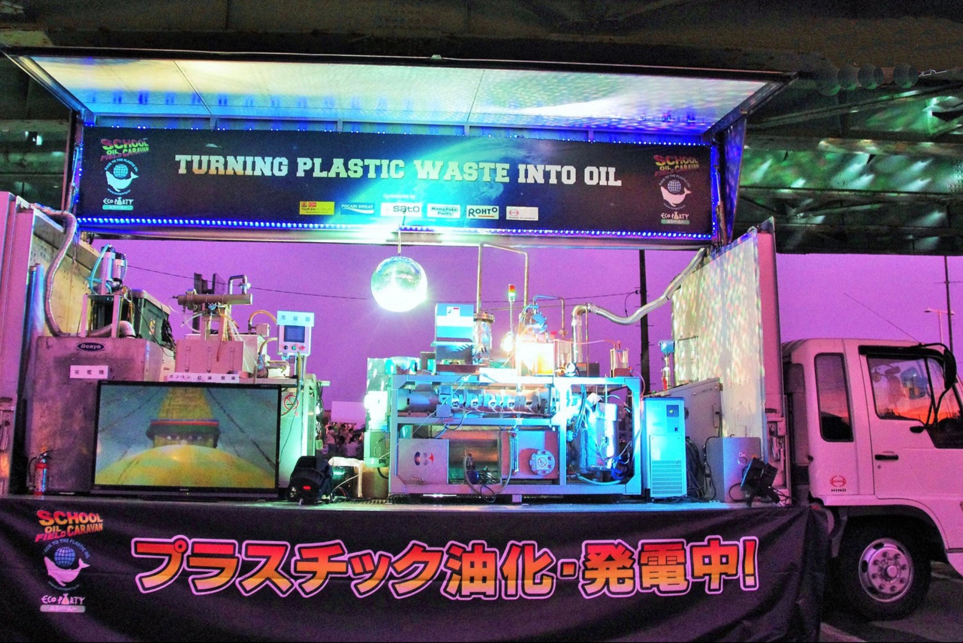 一般社団法人エコパーティが所有する、大型の「プラスチック床装置」によってプラスチックごみからプラスチックオイルを生成し、イベントのステージで使用する電力として再利用します。
