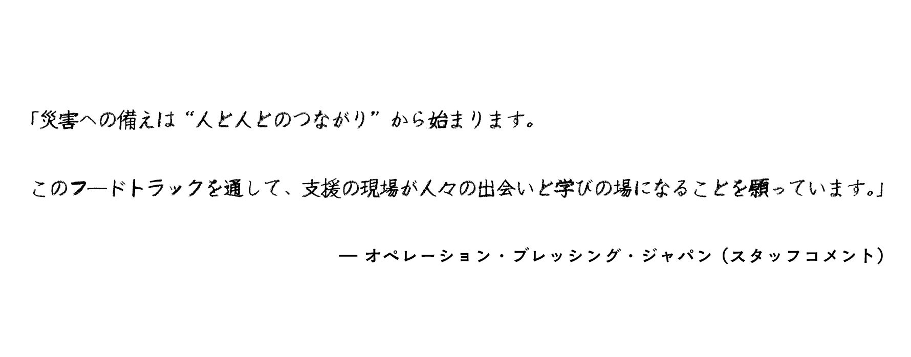 米国に本拠を置く国際NGO Operation Blessing(1978年設立)の国際的なビジョンを共有し連携しながらも、日本法人として主体的に国内外での支援活動を展開しています。