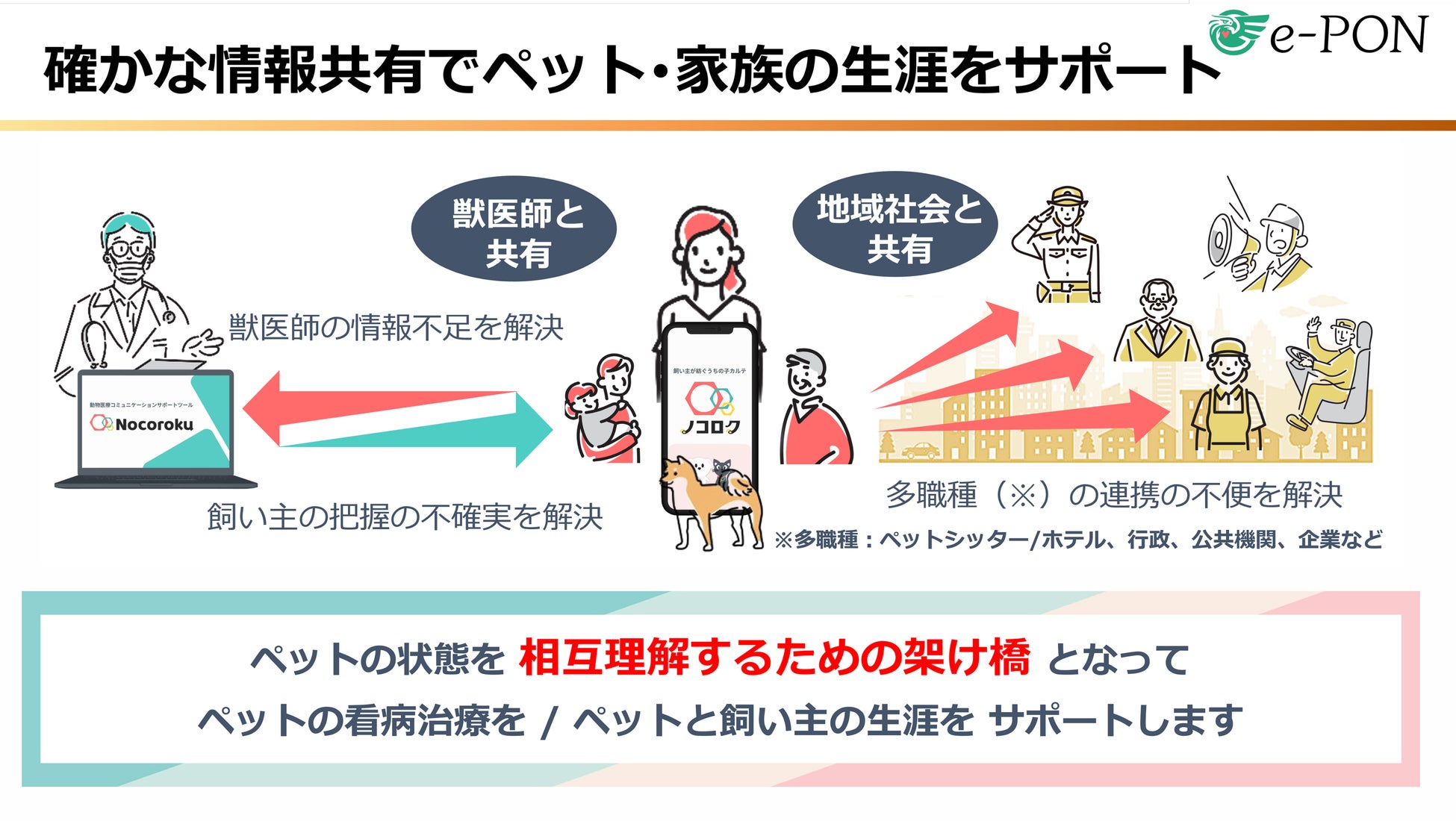 飼い主と獣医師の間で「医療情報把握の不確実性」が診療のボトルネックとなる中、ノコロクは LINEを活用した病歴と病状の記録共有によって、家庭と診察室をリアルタイムでつなぐ新しい治療・看病サポートツールです。飼い主用ノコロクβ版の紹介ページはこちら→https://e-ponvet.com/nocoroku-app